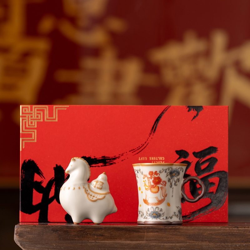 马年开门红礼品,马上有钱杯子摆件套装;马背上葫芦造型,寓意福禄。亚黄汝瓷,玛瑙入釉,蝉翼;内外皆有花面,家有千财万贯,不如汝窑一片。独家专利