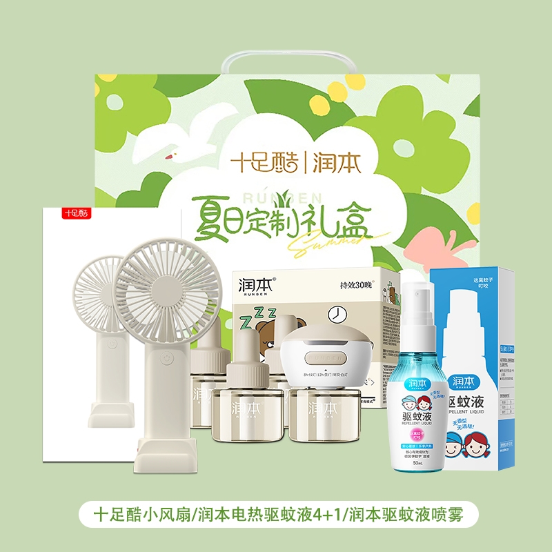 迷你手持风扇、三档调节,手机支架功能;润本电热蚊香液: 法国道达尔溶剂;润本驱蚊液: 50ml,7%驱蚊酯驱蚊液