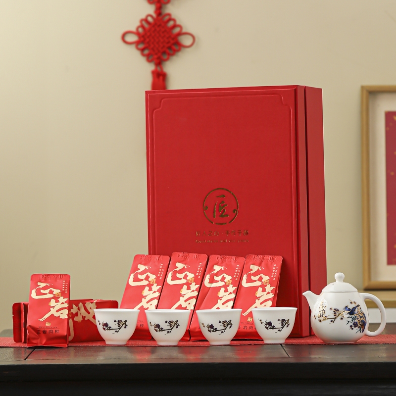 加入PPT羊脂玉瓷,高温烧制,润白通透,细腻温润。;喜上眉梢金色图案吉祥喜庆,预热变色,色彩丰富可观赏;武夷岩茶核心产地,气候条件良好,传统工艺匠心制作。;条索紧结卷曲,入口带草木气息及浅浅桂皮香,韵味悠长;茶汤浓郁,入口润滑柔和,回甘持久,茶香宜人。