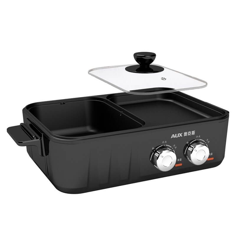 烤涮一体锅,煎/炒/焖/煮/炖/涮;精致容量,可1-3人使用;1200W功率,双旋钮开关;左涮右烤,双区独立控温;食品接触级不粘涂层,易清洁不粘锅