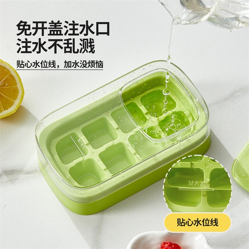 一按出冰,快乐冻起来,0触冰,秒脱冰,注水快。;一按即落,冰爽无阻,对角按压脱冰,轻松脱模。;大大大大倾倒口,咔咔倒冰不易堵。