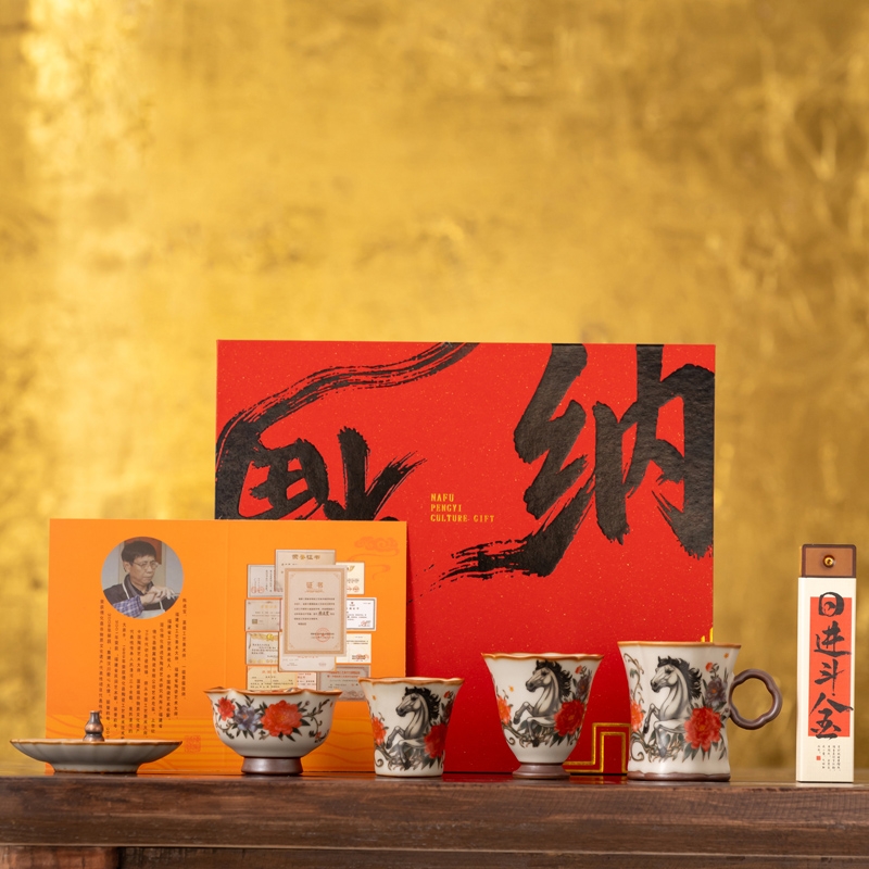 马年开门红礼品,马到成功杯子套装,配日进斗金线香;带香插莲花香盘。亚黄汝瓷,玛瑙入釉,蝉翼开片,;家有千财万贯,不如汝窑一片。独家专利技术新品