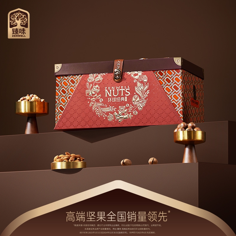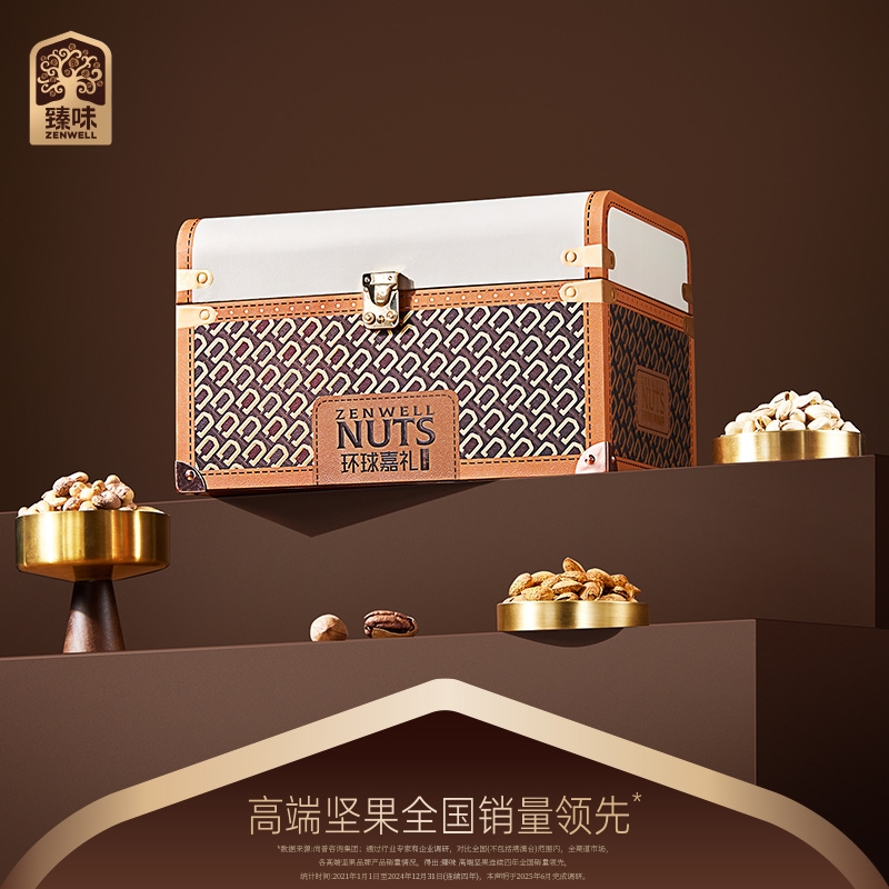 艺术与灵感糅合,铸就非凡杰作;精致木箱包装,皮革铆钉点缀;搭配高档皮质提手,打造臻味全新环球尊礼坚果礼盒
