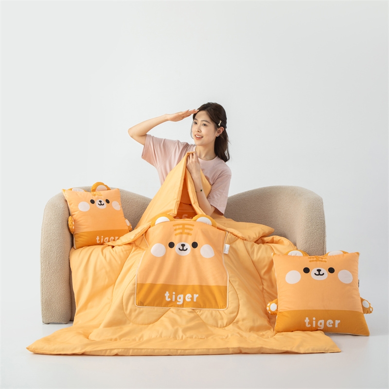 活性印染工艺,图案清晰,色牢度高,不易脱色;抱枕被设计,一枕多用,可做靠枕,打开可做被子;细密卷边工艺,针脚紧密,耐磨耐用