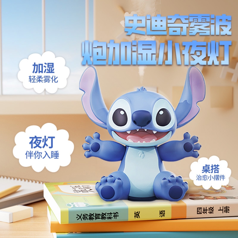 加湿+夜灯双效合一,氛围感与湿润度一步到位。;细腻补水不打扰,柔光护眼不刺眼,卧室必备。;正版史迪奇造型,可爱治愈拉满,送礼自用超有面!
