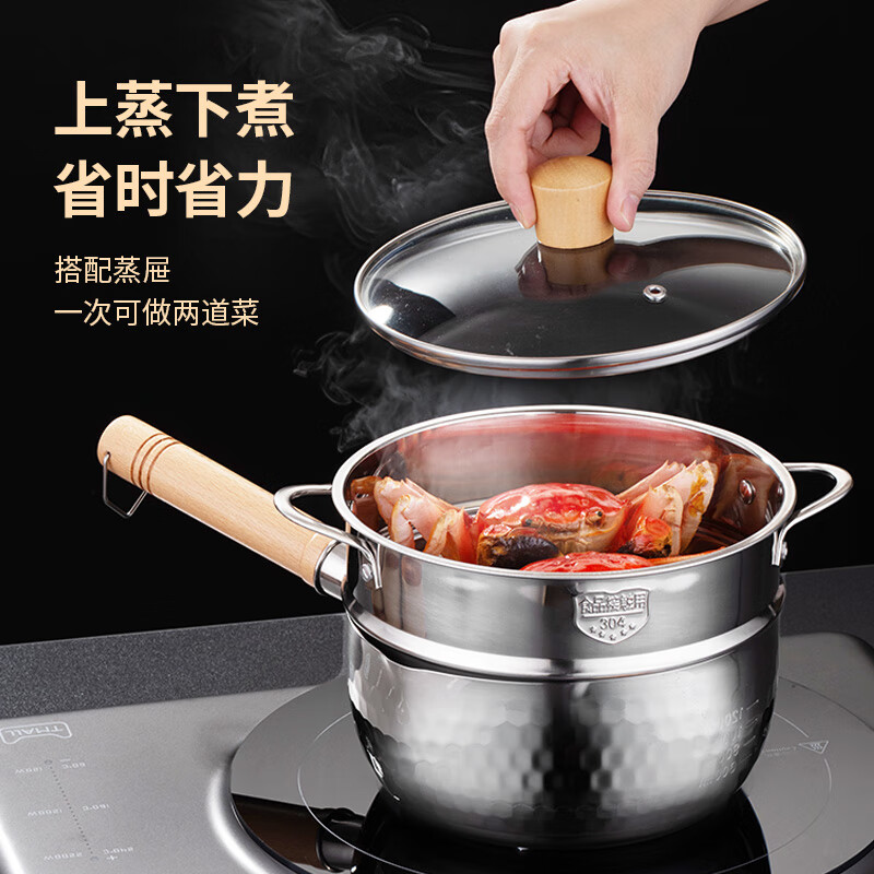 加厚SUS304三层钢一体成型;加长手柄,隔热防烫,铆钉加固;可热奶、煮面、煮汤等,一锅多用