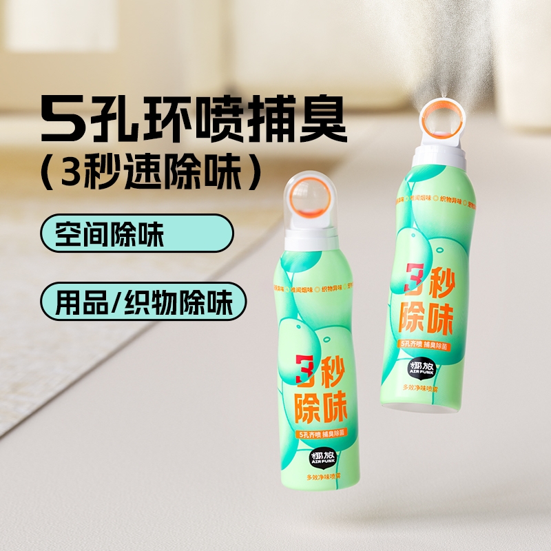区别于普通水雾/气雾瓶,能5孔齐喷捕臭除菌;双成分添加,专研净难除烟味,对付生活中二手烟三手烟;1瓶解决厨厕异味/食物异味/织物异味/宠物异味等