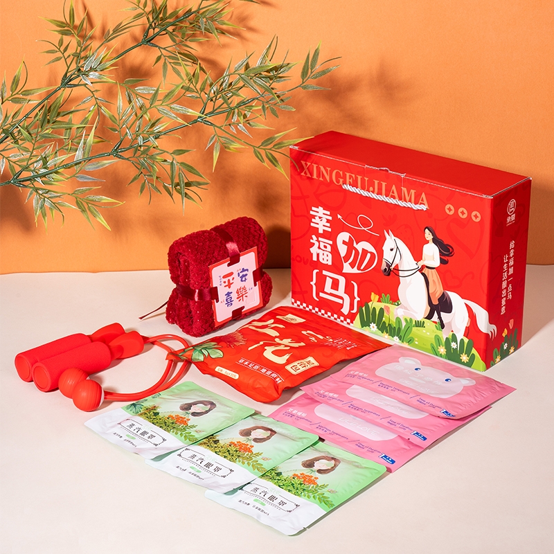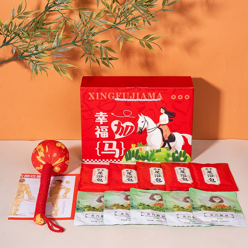 “幸福加马”,谐音幸福加码,送给客户加倍的幸福;艾草锤定制中国红金元宝面料,专属财运+1的美好祝福;精美彩袋十二味草本足浴包,每袋20g,泡脚效果好