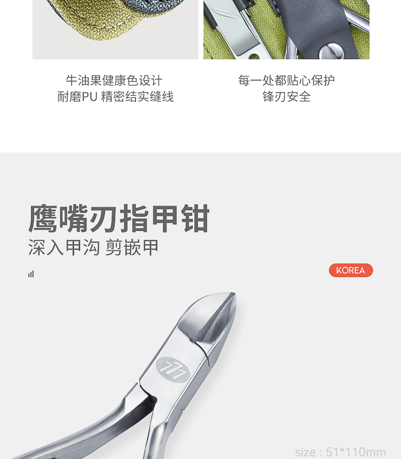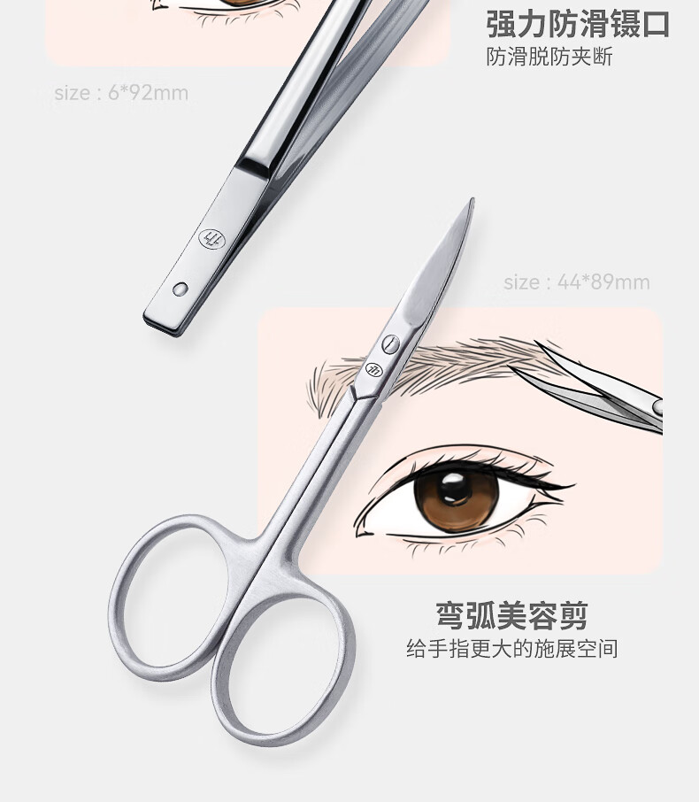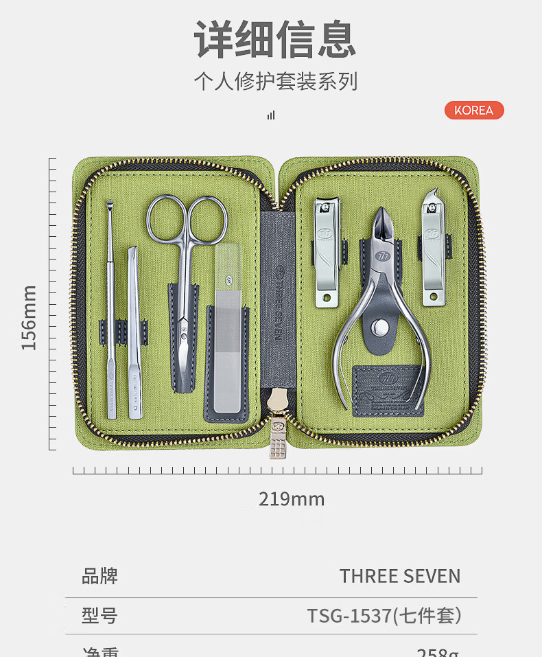套装内容:7件套(指甲刀、斜口指甲刀、大口钳子、眉毛剪,耳挖,眉夹,玻璃锉)