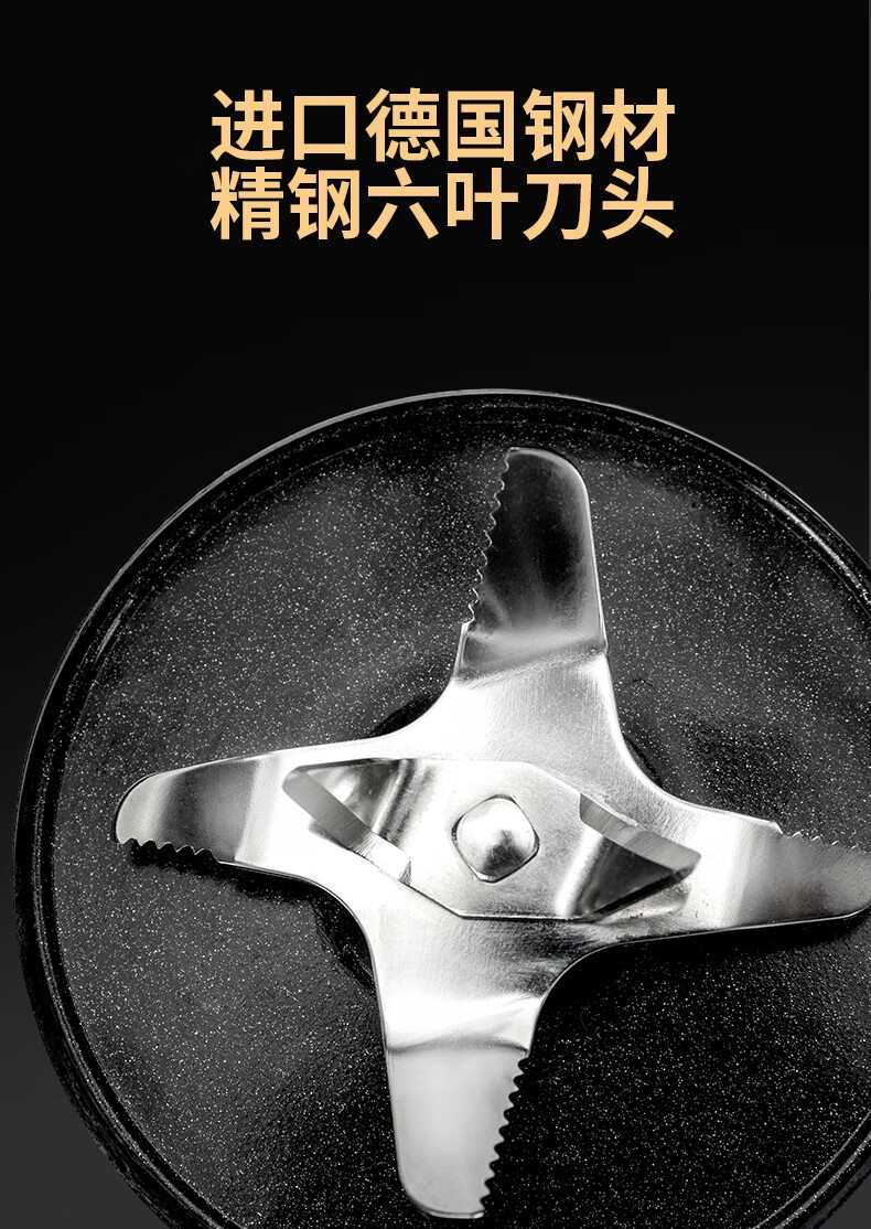 德国进口钢材,精钢六叶刀头,口感更细腻;一机多用,六大菜单功能,12H预约;1.2L五层高硼硅玻璃杯,耐受冷热冲击不破裂;一键自动清洗,简单方便;食品级认证,防糊底涂层,不沾底、易清洗