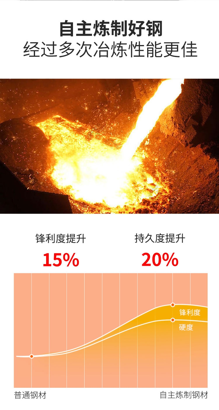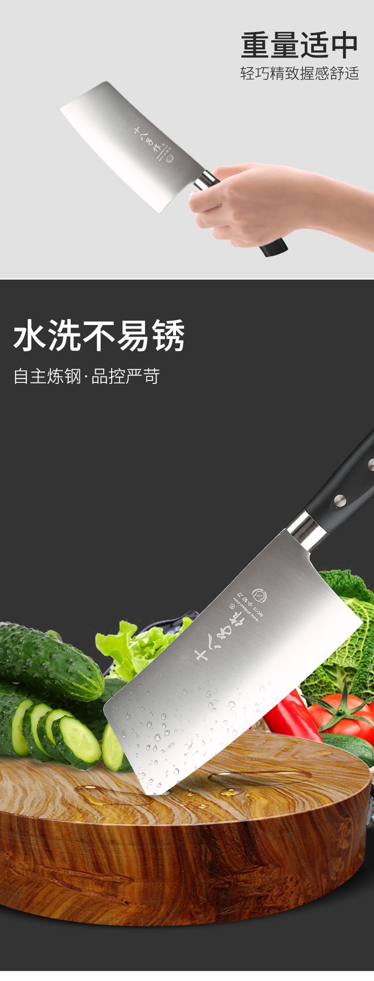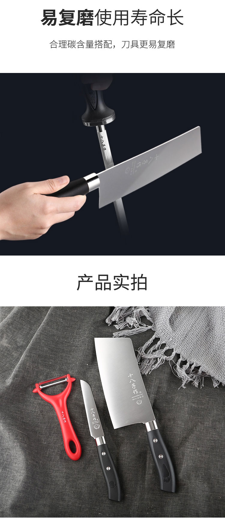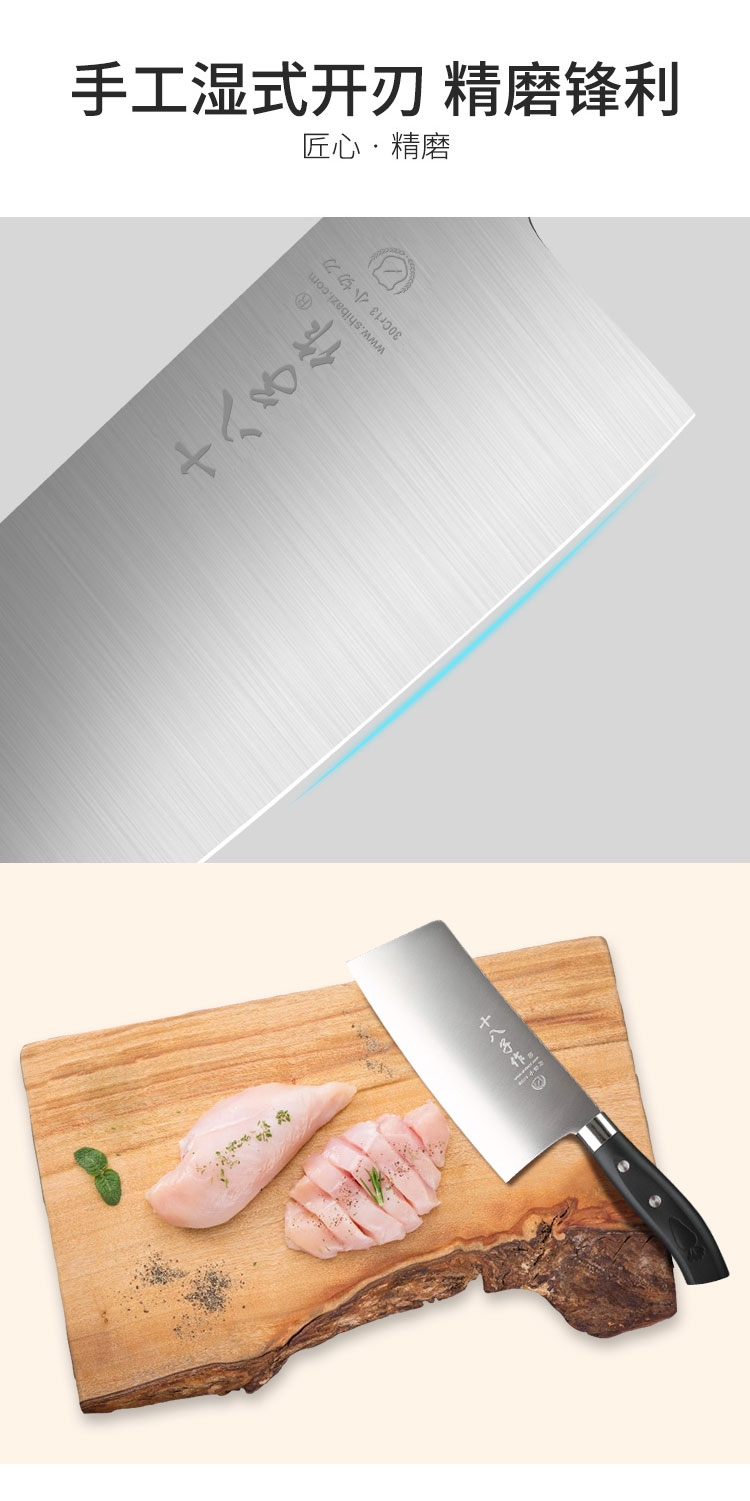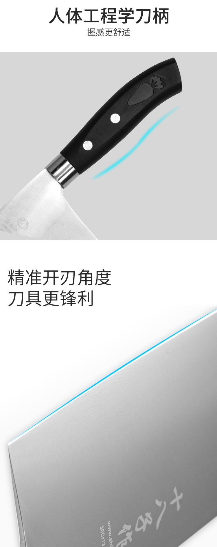 刀体采用30Cr13材料,耐腐蚀性好,硬度适中;刃口偏向于切片功能,适用于蔬菜、鲜肉等软组织食品;锋利持久性较好,易复磨