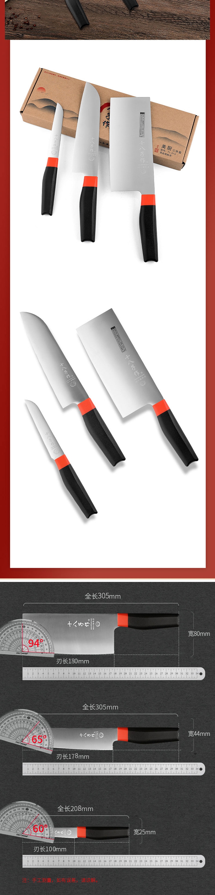 规格:切片刀180*80*1.8mm,多用刀178*47*1.8mm,水果刀100*21*1.2mm