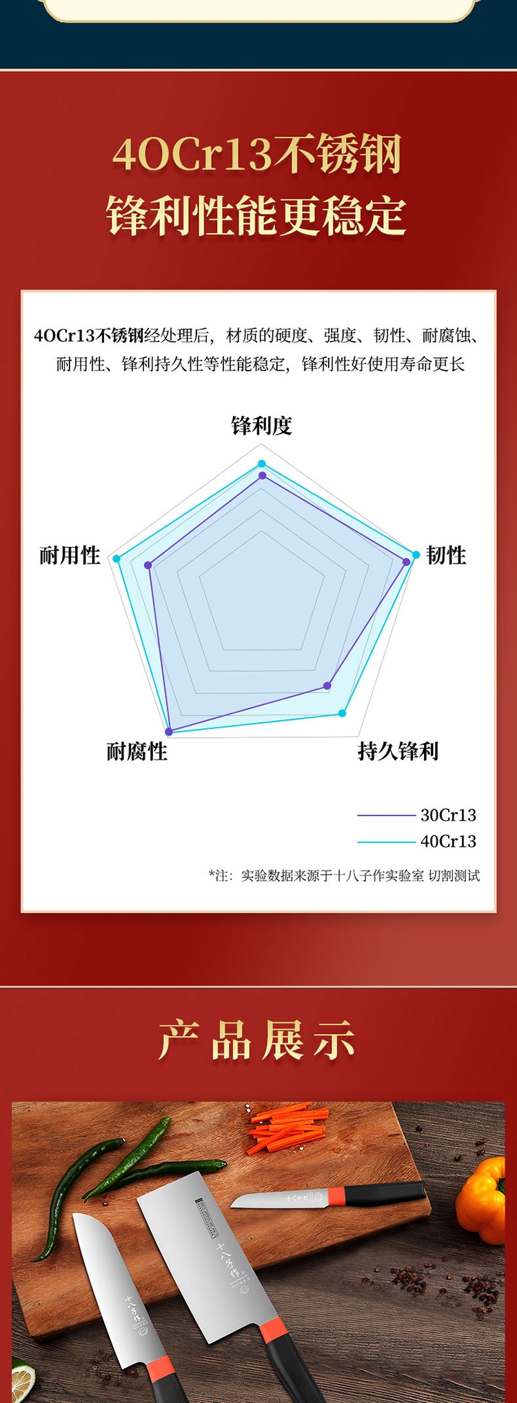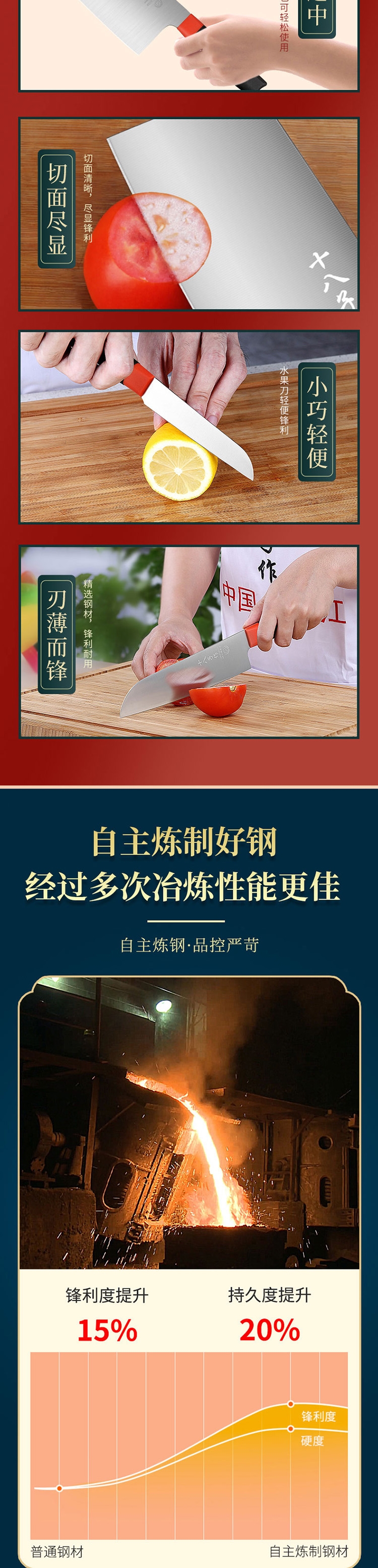 40Cr13钢材,硬度适中,耐腐;双色柄设计,防冻防滑,美观;功能有切片,多用、水果刀,分工明确