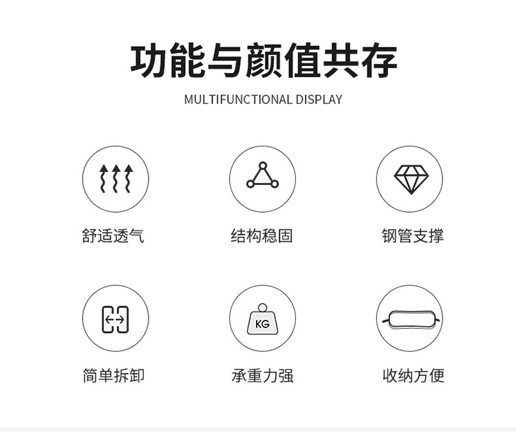 高承重、复合网布,舒适透气;;轻便折叠设计、 简单拆卸、不占空间;;高颜值、牢固性强,经久耐用 ;