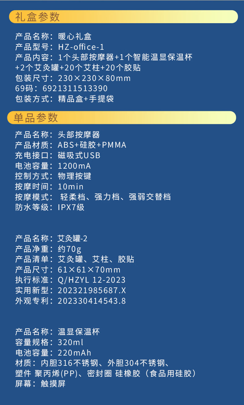 配置清单:1个头部按摩器+1个智能温显保温杯+2个艾灸罐+20个艾柱+20个胶贴