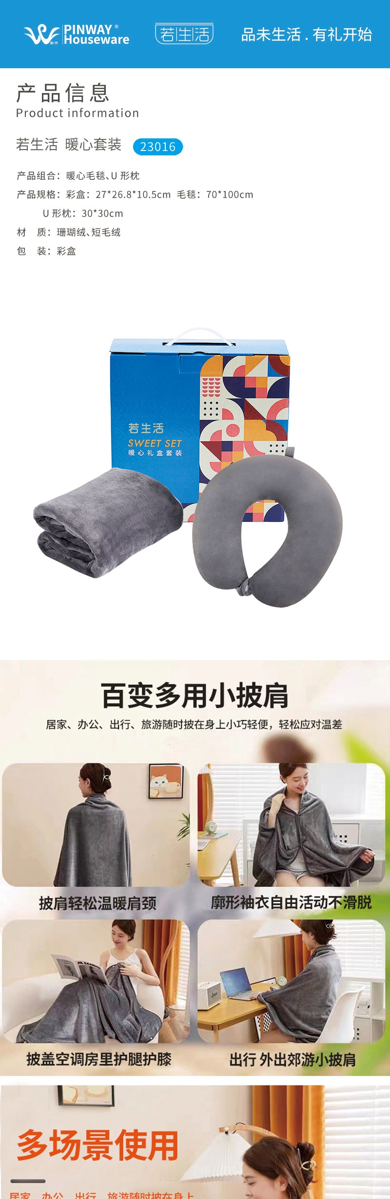 产品规格:彩盒:27*26.8*10.5cm 毛毯:70*100cm U形枕:30*30cm