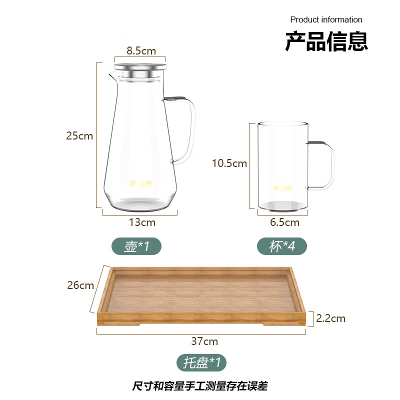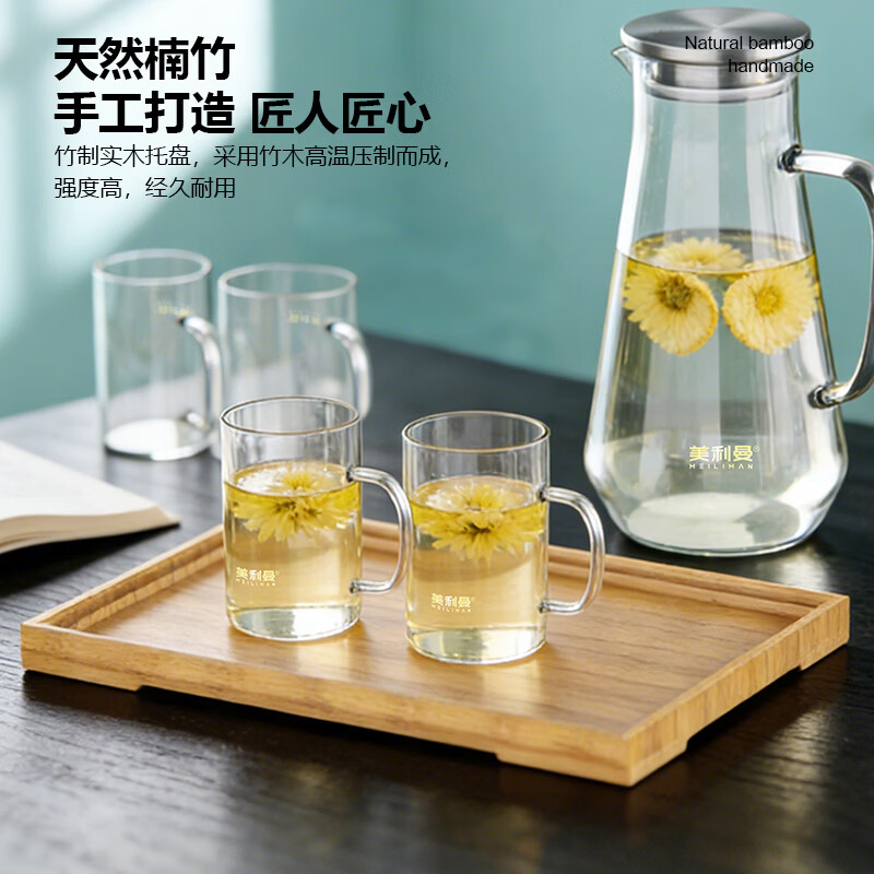 配置清单:凉水壶1500ml*1、玻璃把杯300ml*4、楠竹木托盘*1