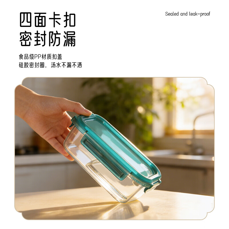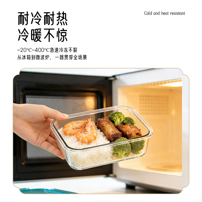 高硼硅玻璃盒身,抗震耐刮擦;耐温差-20°至400°适用于微波炉、烤箱;最高等级FDA检测PP食品级材质,四面锁扣密封防漏
