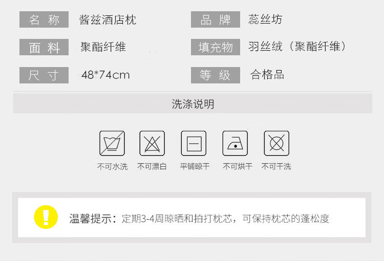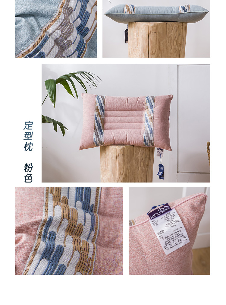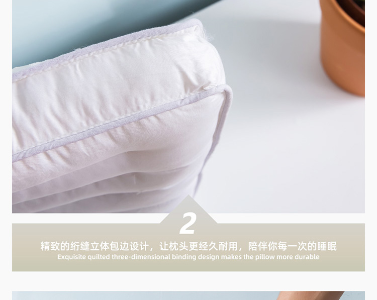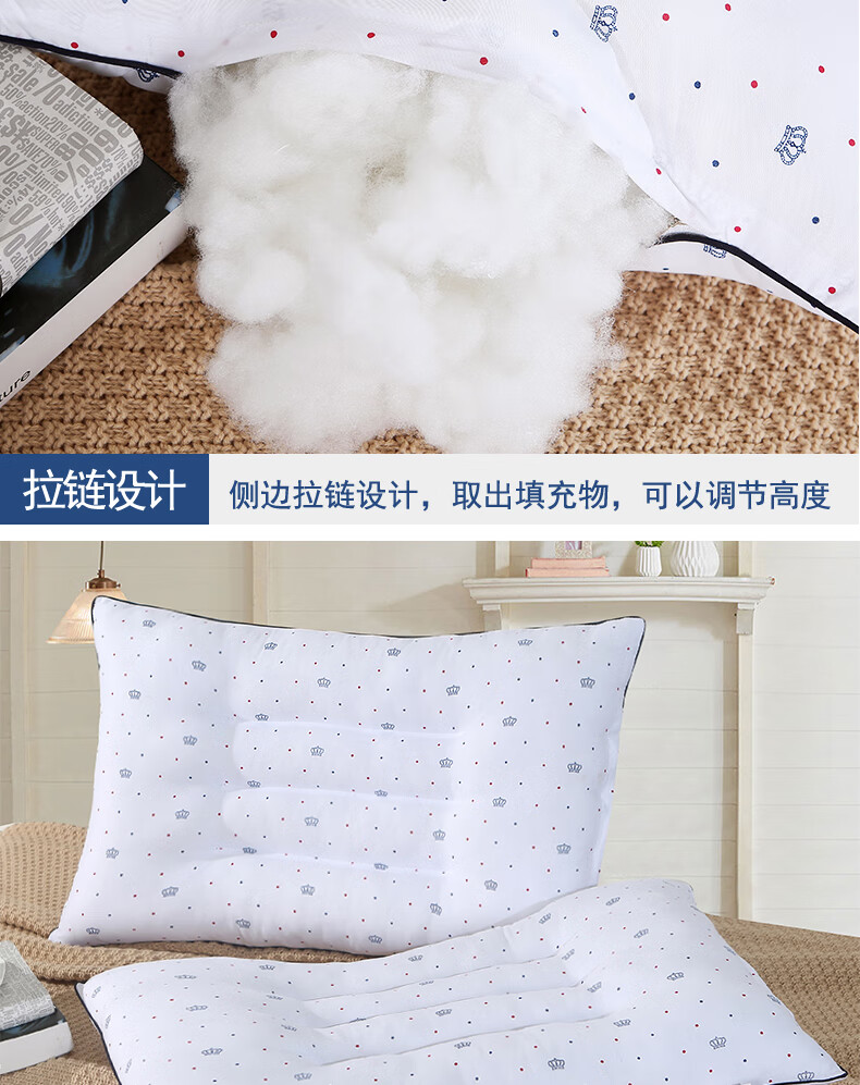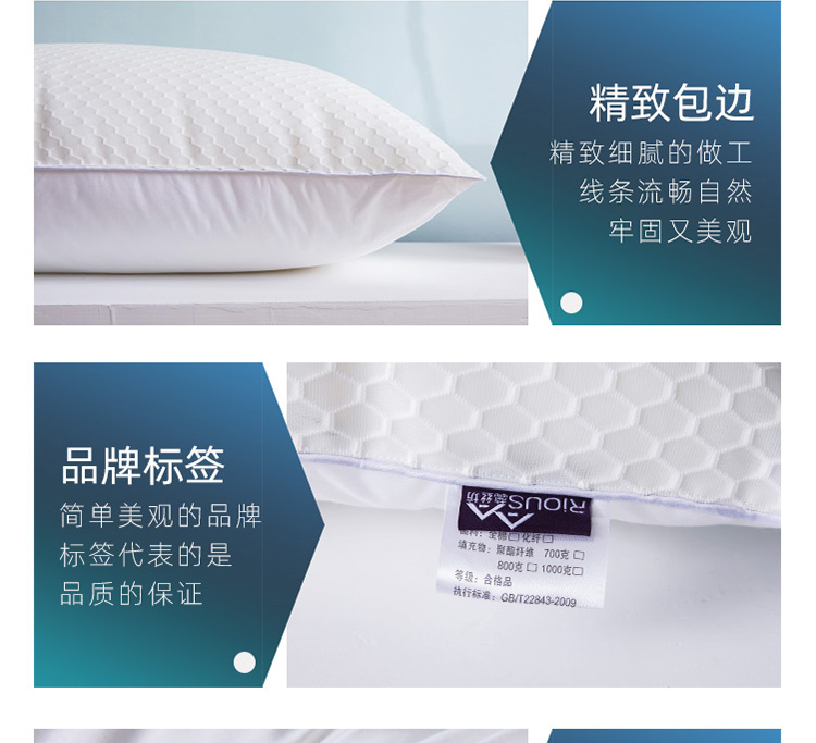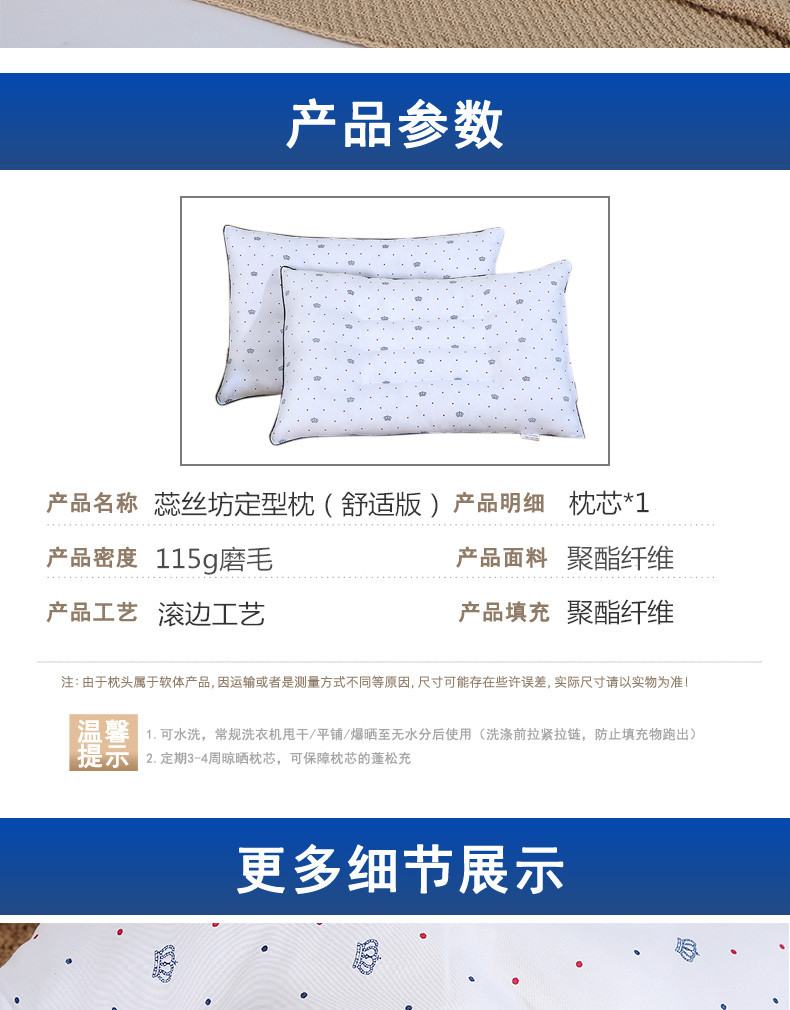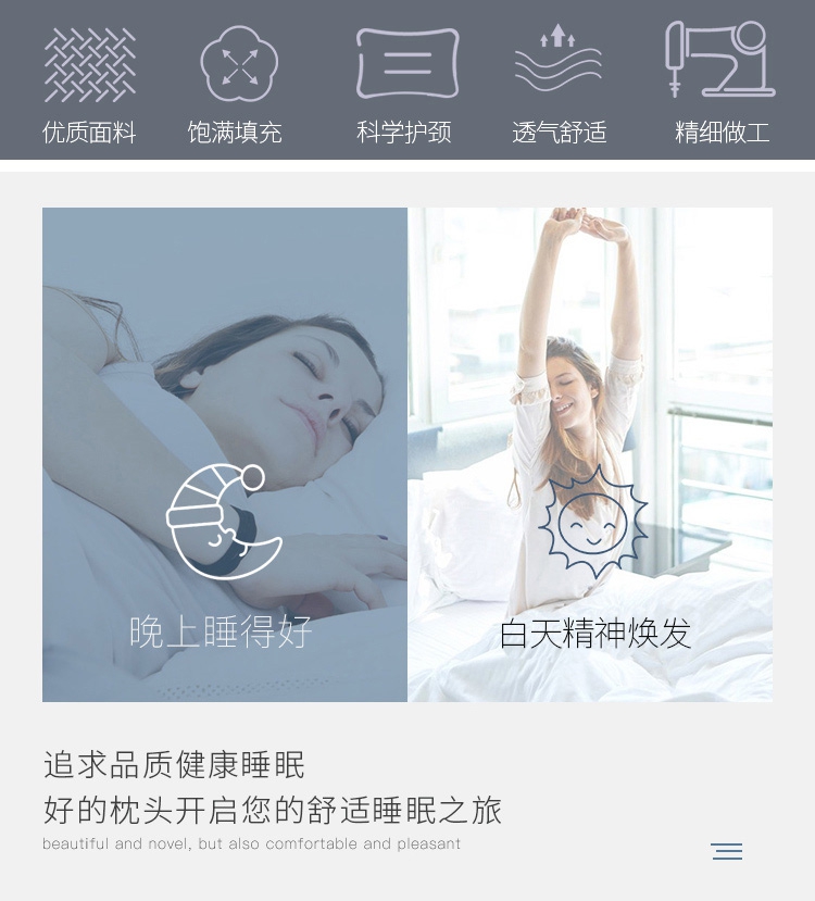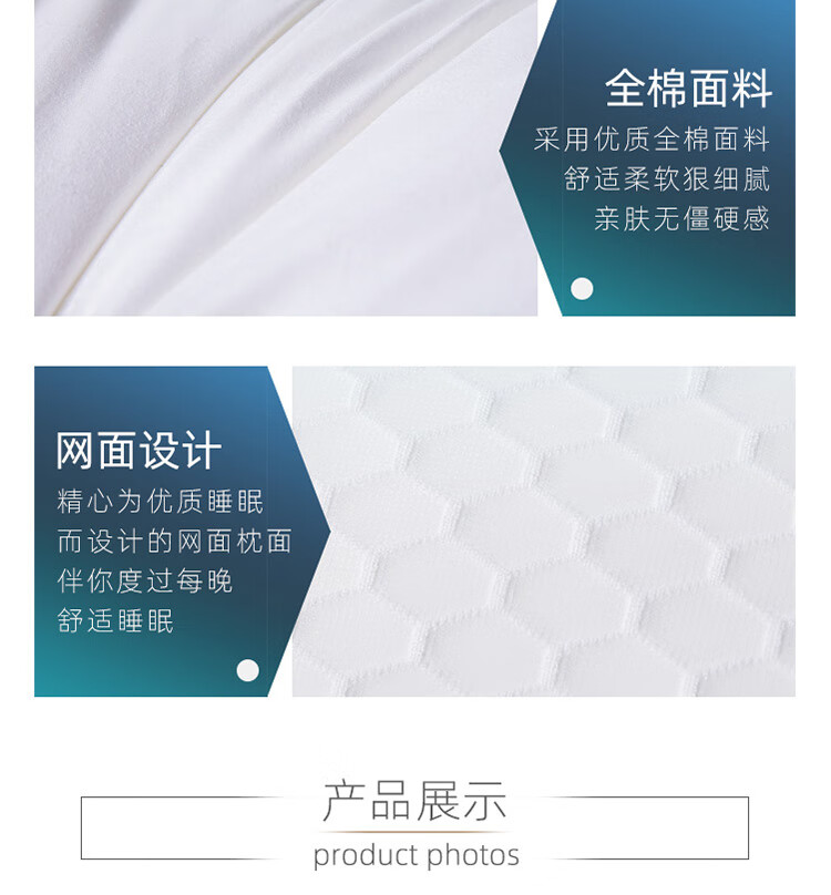 全棉面料,网面设计,全棉面料,超细羽丝绒纤维填充;有很好的导湿性和透气性,蓬松舒适;呵护颈椎呵护颈椎回弹性好,不坍塌,不变形。