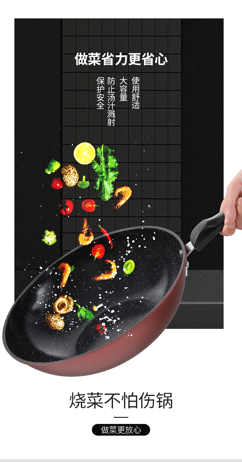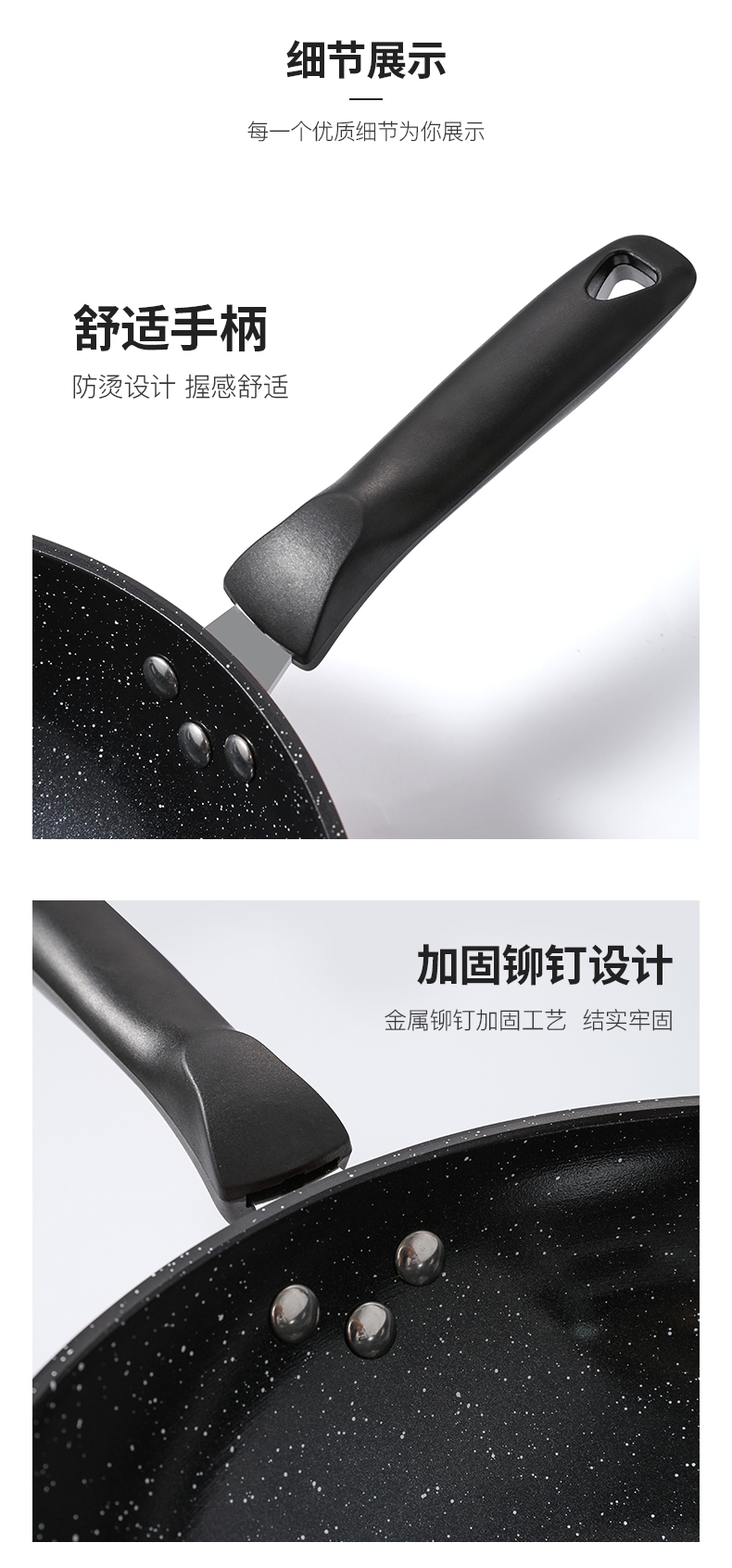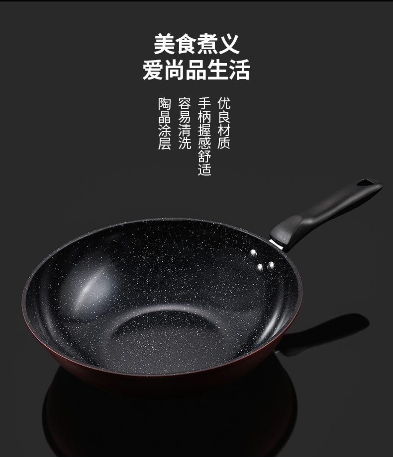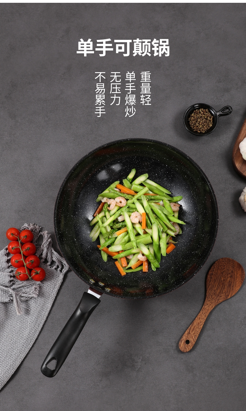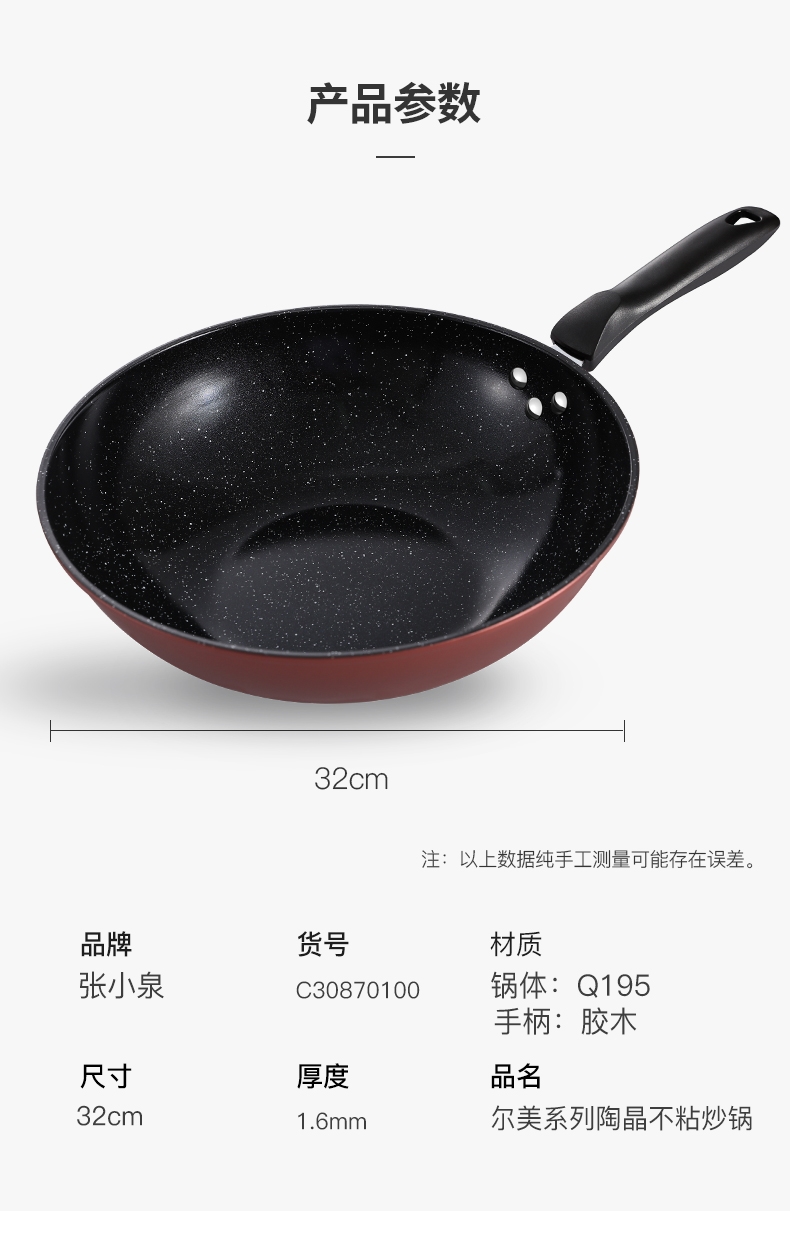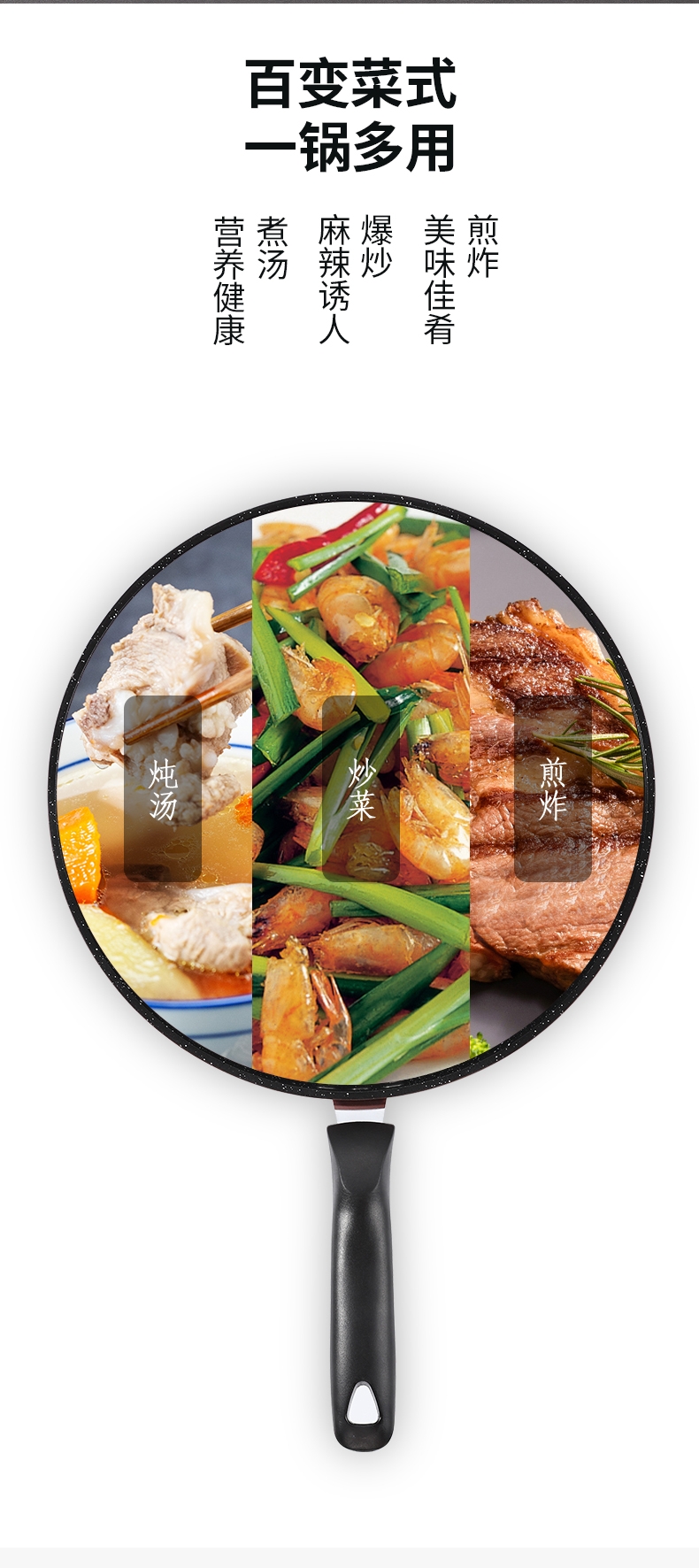 φ32cm黄金尺寸,少油烟,健康烹饪易清洁;1.6mm加厚锅体设计,传热均匀更耐磨;燃气、电磁一锅多用(需避免高温干烧)