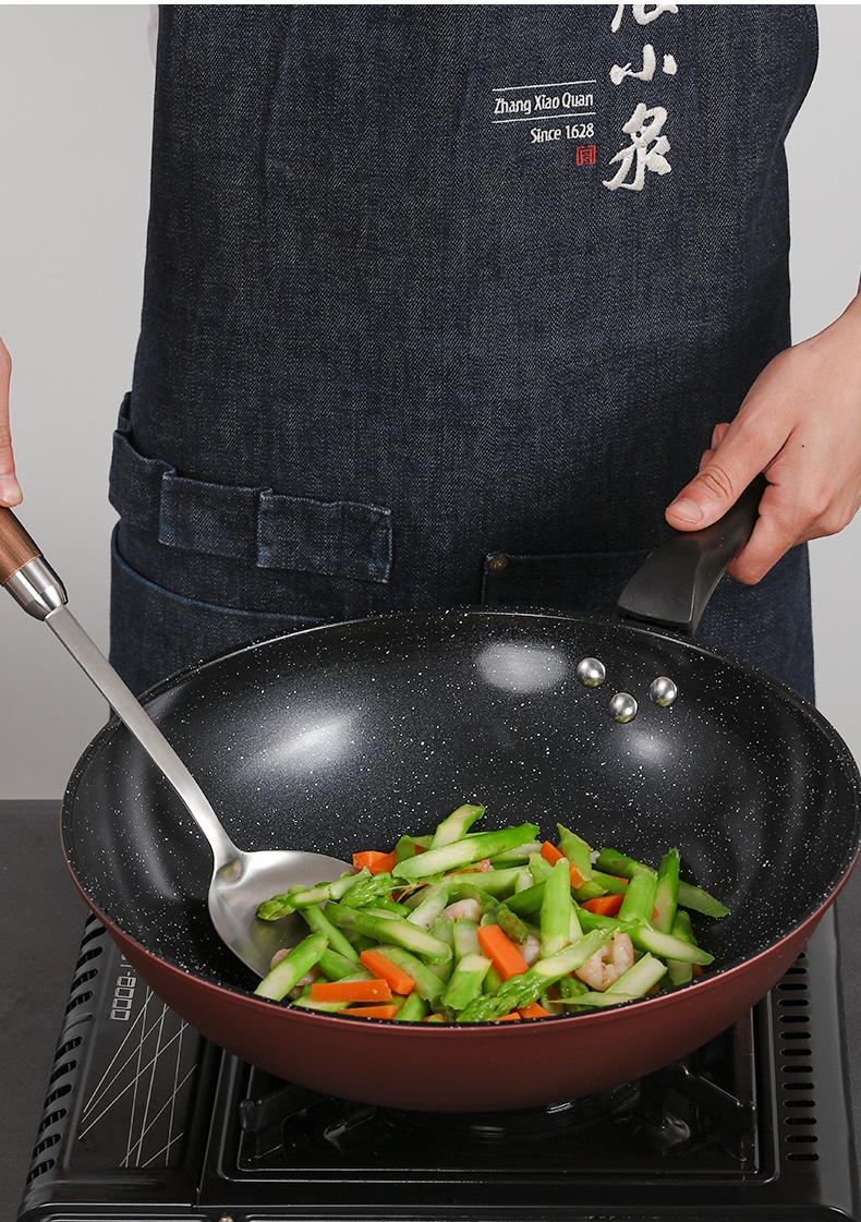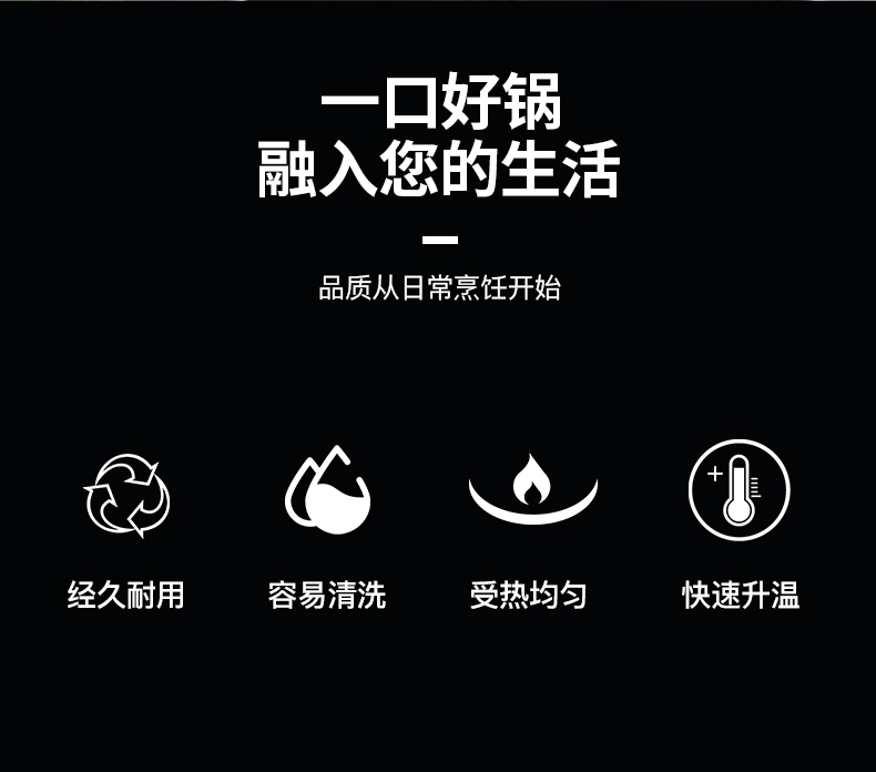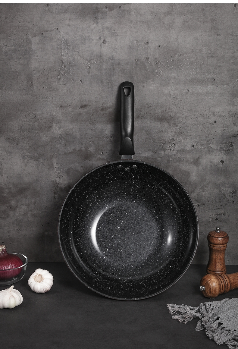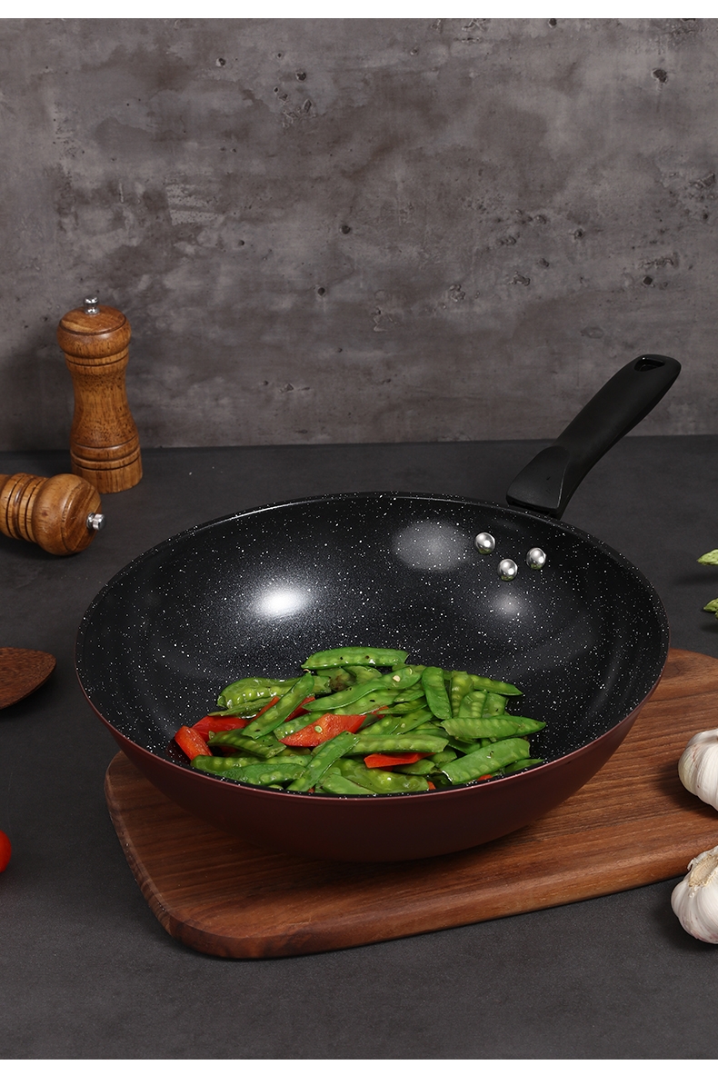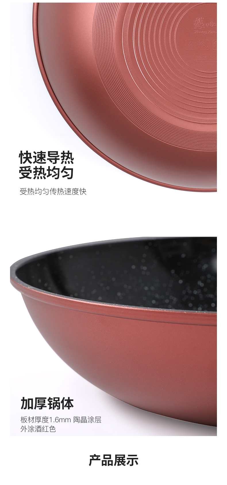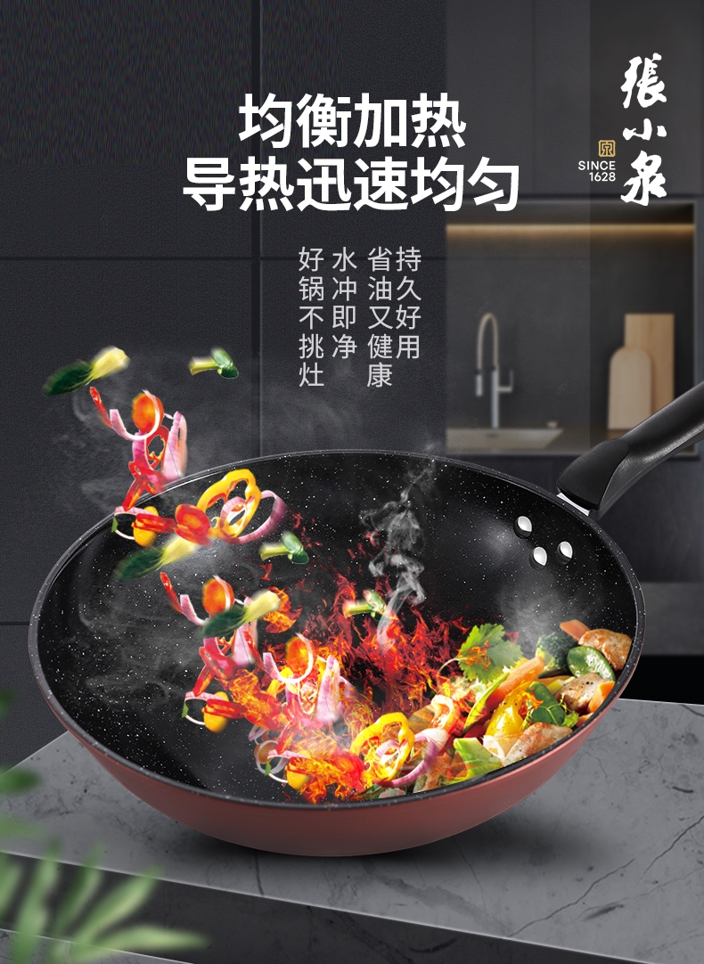 φ32cm黄金尺寸,少油烟,健康烹饪易清洁;1.6mm加厚锅体设计,传热均匀更耐磨;燃气、电磁一锅多用(需避免高温干烧)