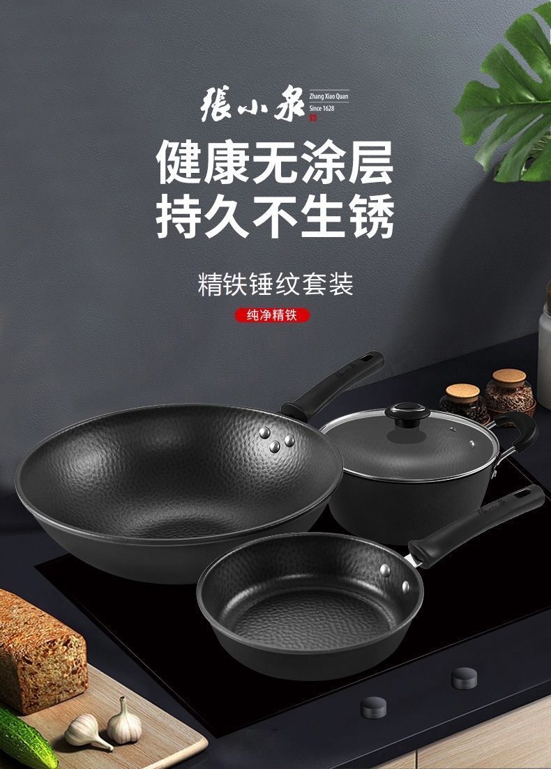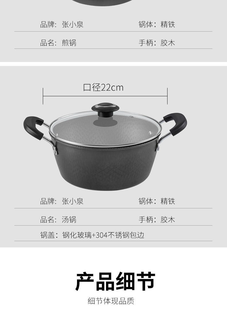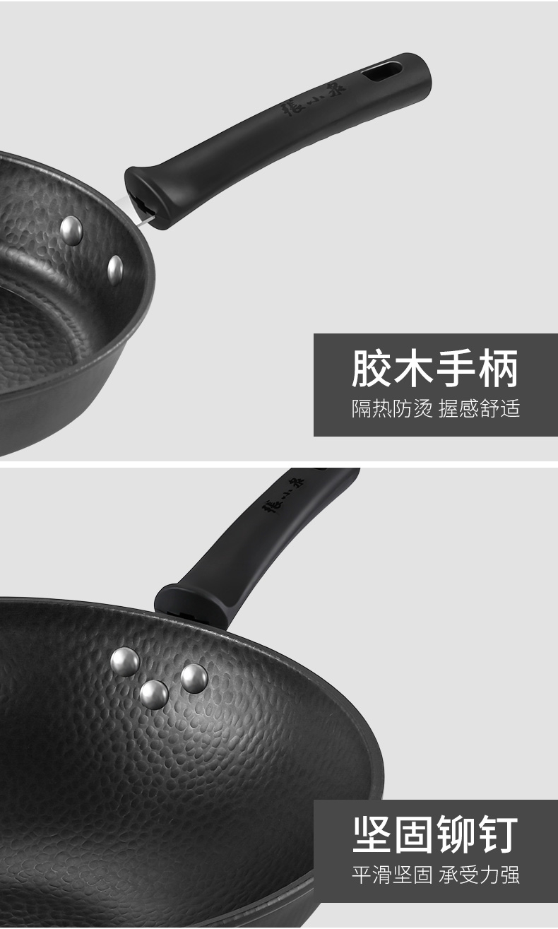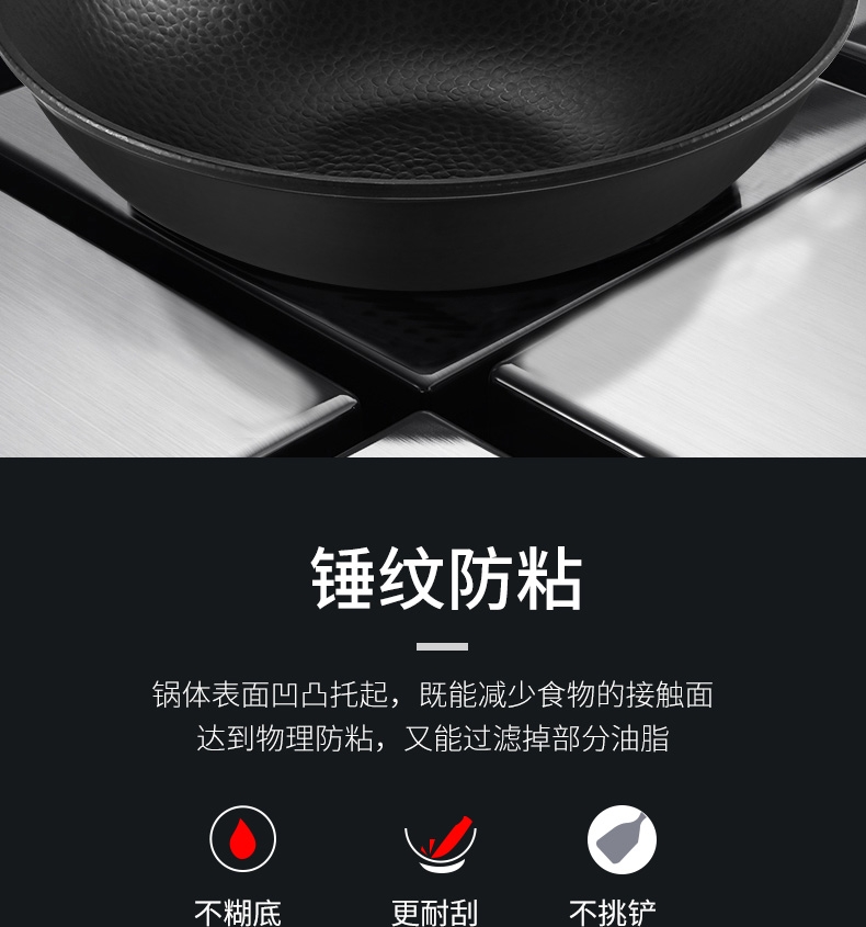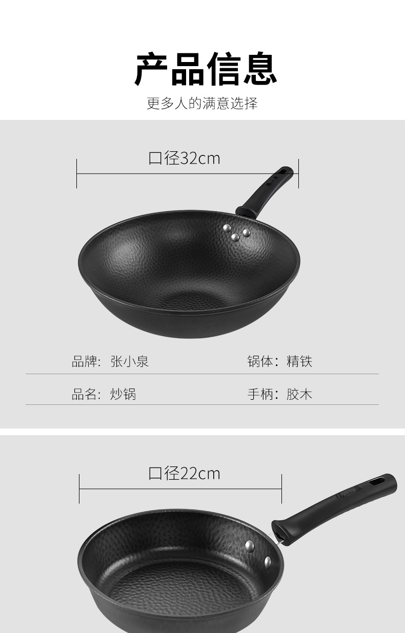 炒锅φ32cm/煎锅φ22cm/汤锅φ22cm;精铁基材,锤纹工艺,物理不易粘,无涂层更健康;胶木硅胶手柄,握感舒适