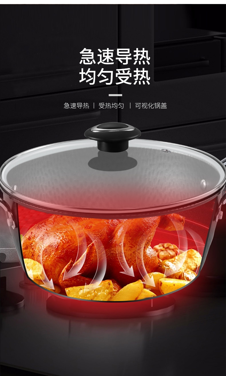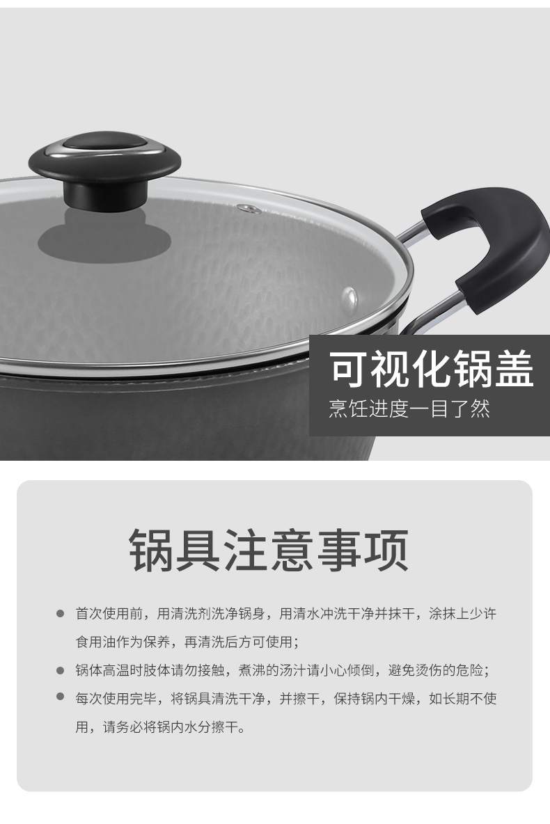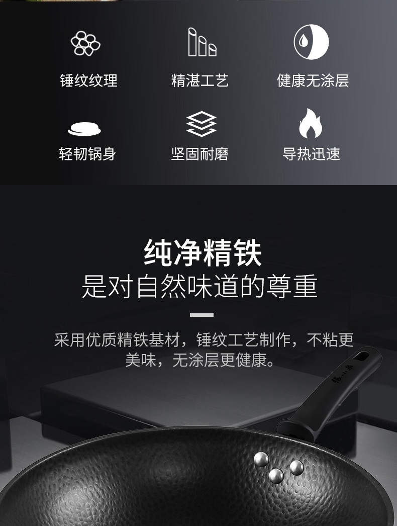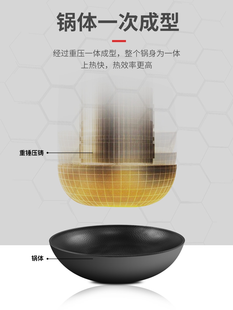 炒锅φ32cm/煎锅φ22cm/汤锅φ22cm;精铁基材,锤纹工艺,物理不易粘,无涂层更健康;胶木硅胶手柄,握感舒适