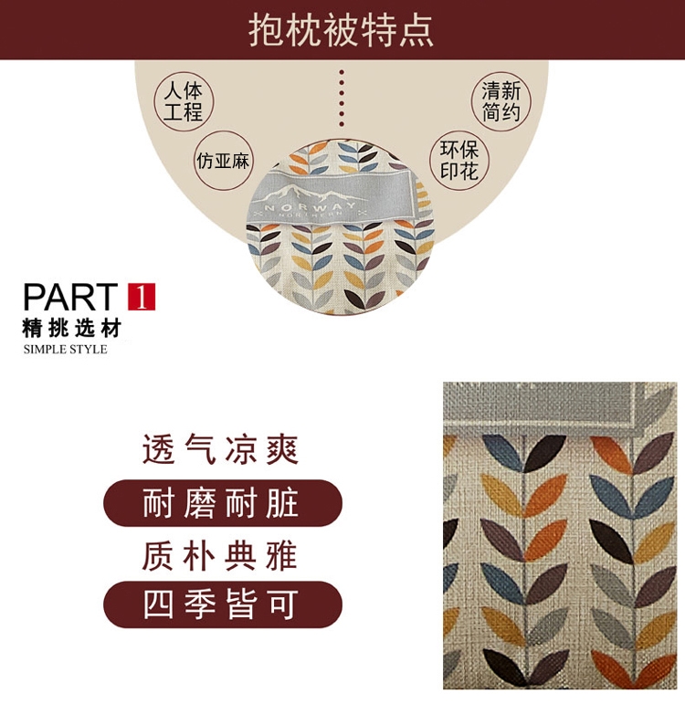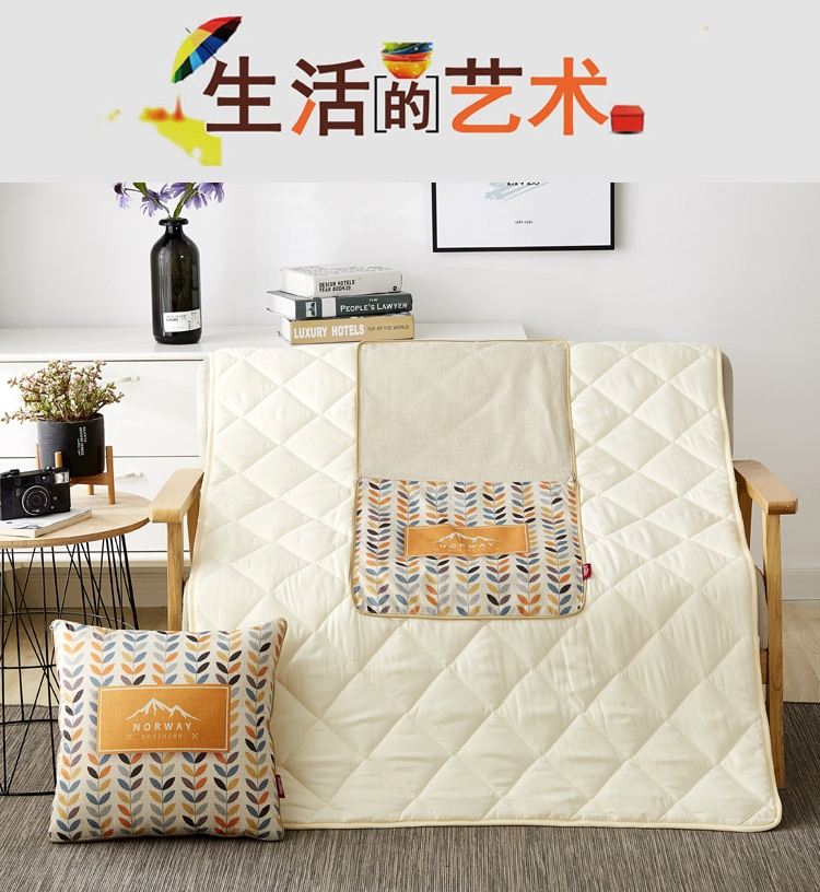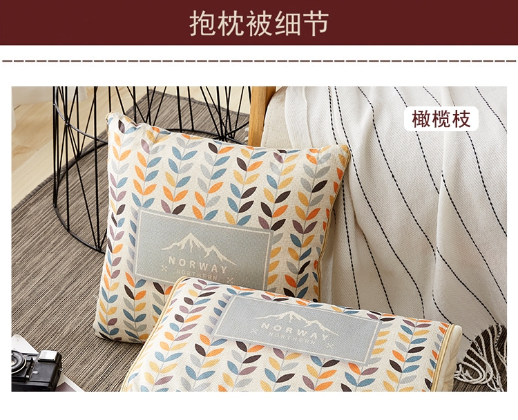 枕面使用仿亚麻面料,手感细密有质感;被面使用舒香棉面料,柔软亲肤,透气性能强;进口定位数码印花工艺,色彩鲜亮,不易褪色;一物多用,可盖,可靠,方便携带;可整版定制客户专属花型