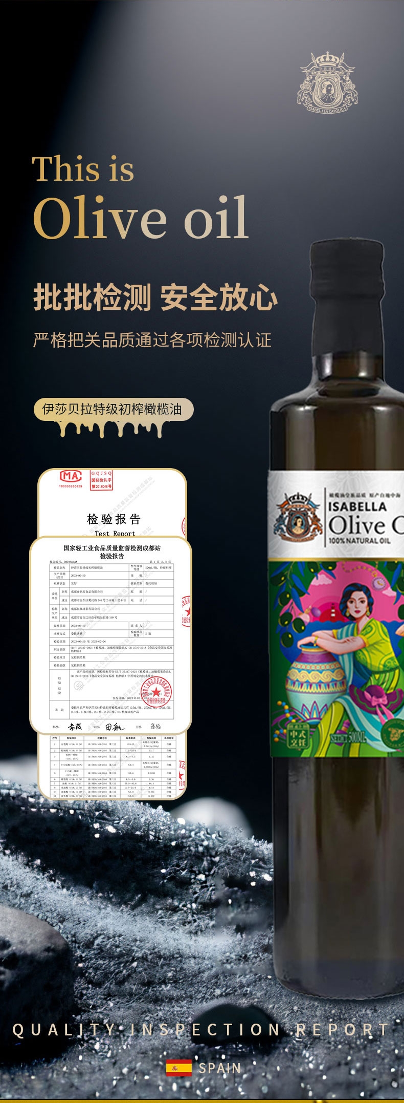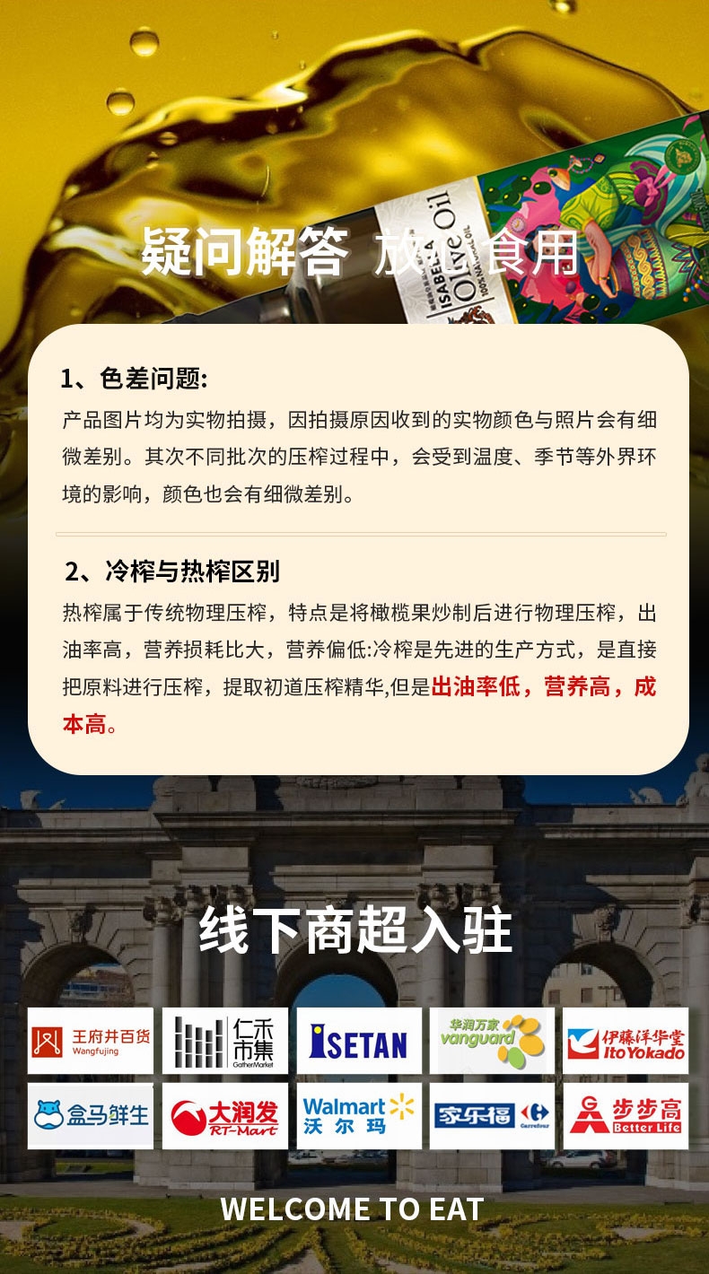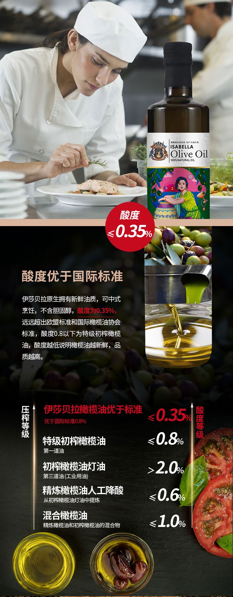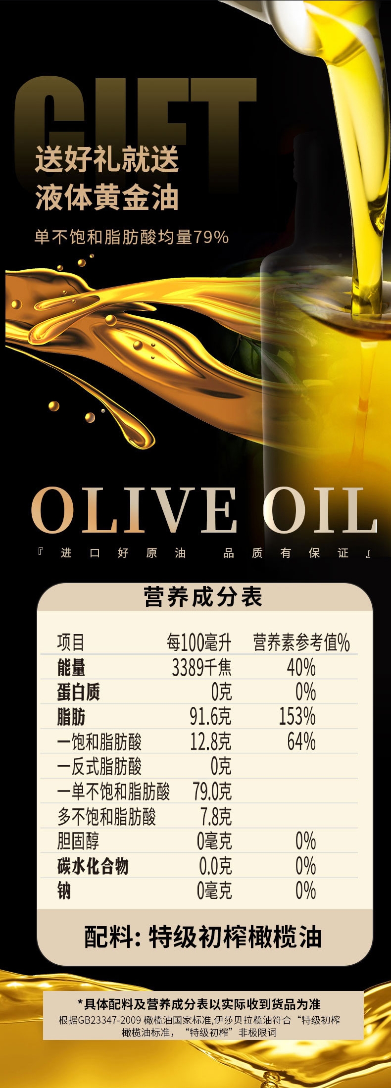 富含单不饱和脂肪酸,多不饱和脂肪酸;橄榄多酚:含量≥400ppm(毫克/千克);单不饱和脂肪酸79%