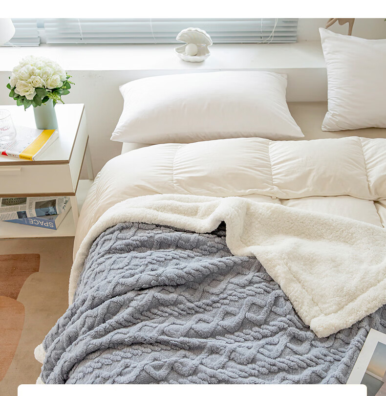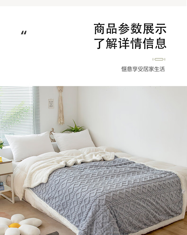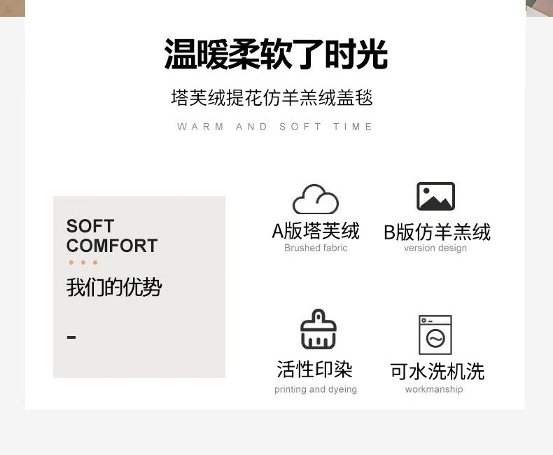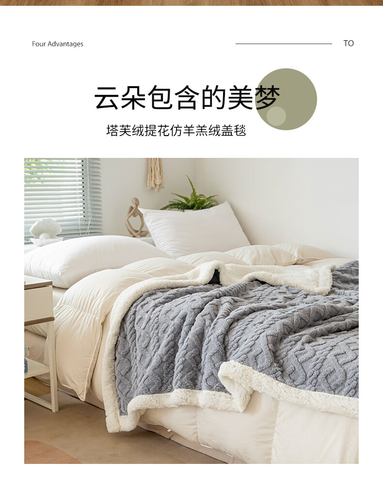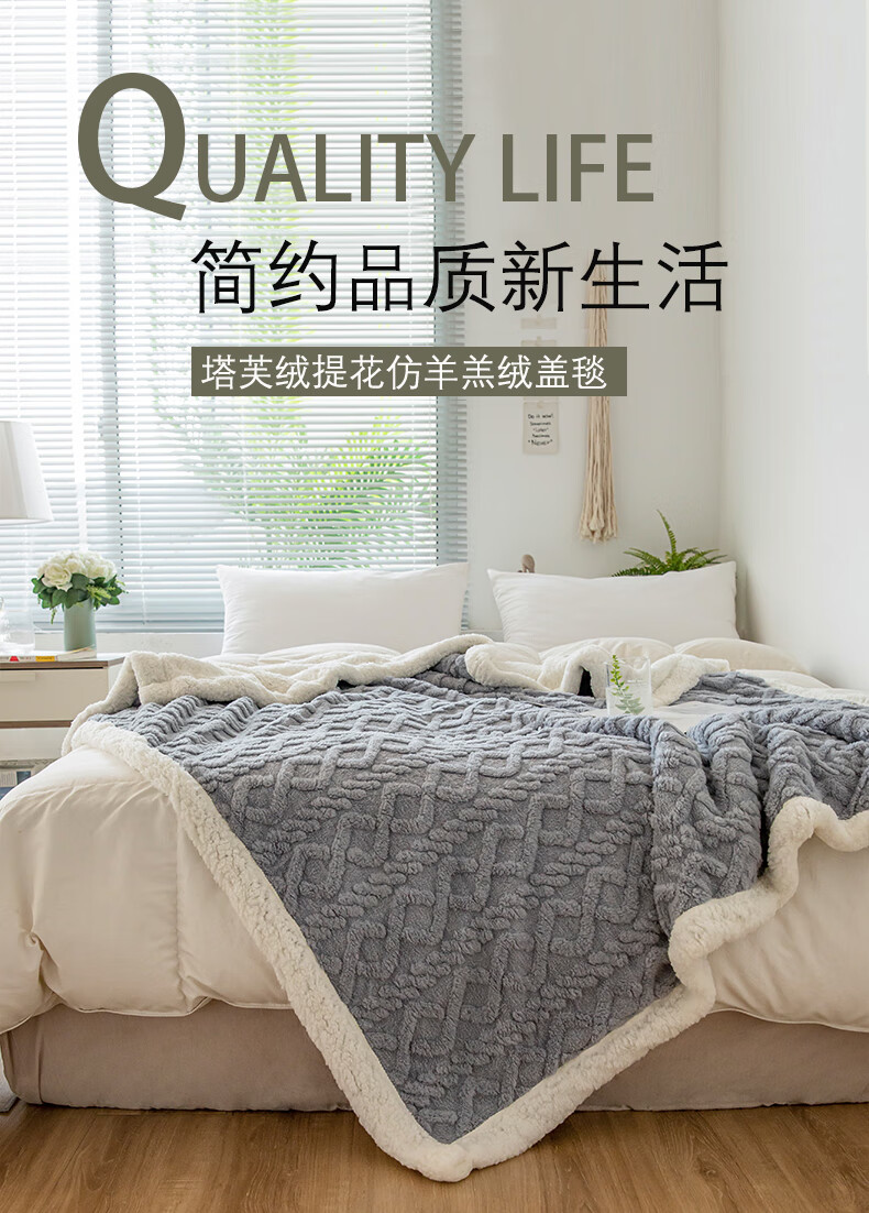 舒适柔软塔芙绒毛毯;双面加绒,加密加厚;高品质克重绒面。一触即暖,一毯多用。
