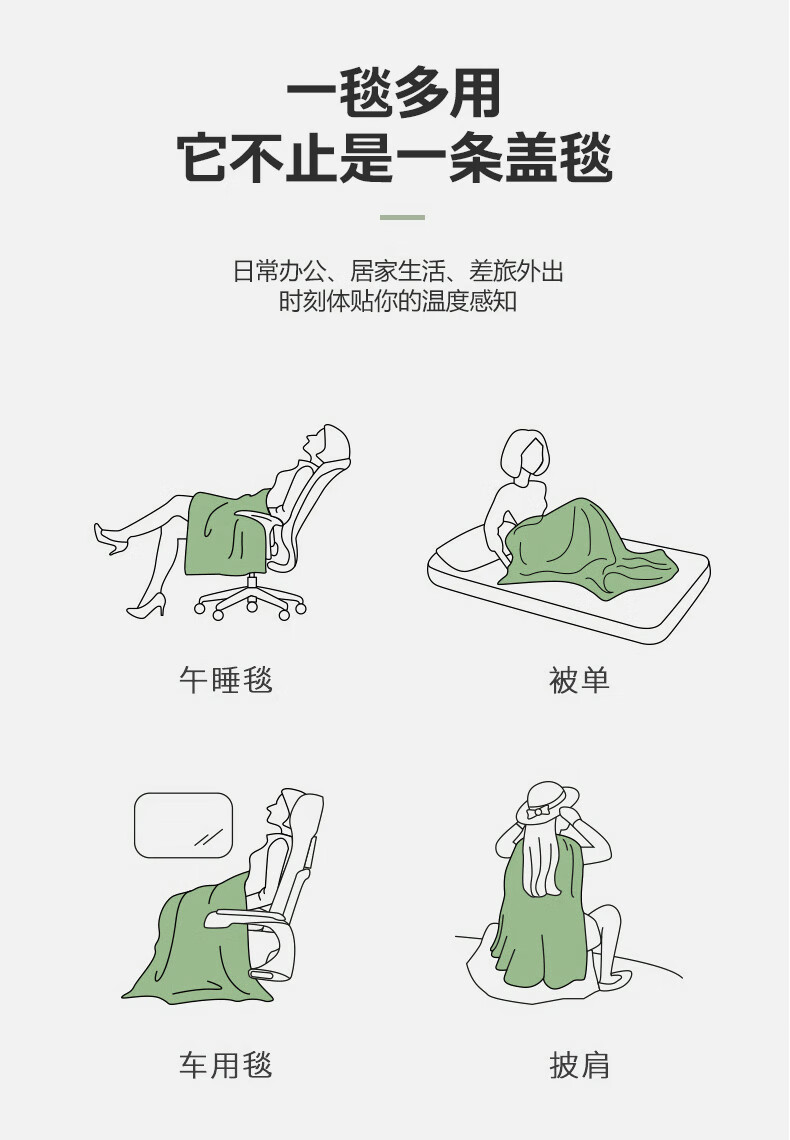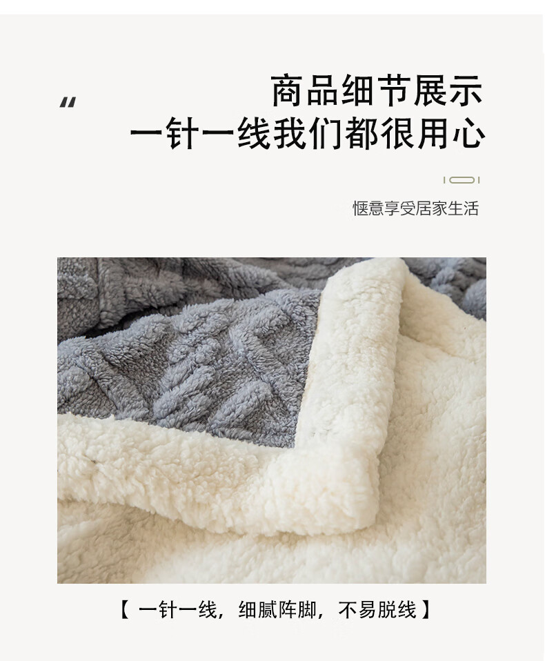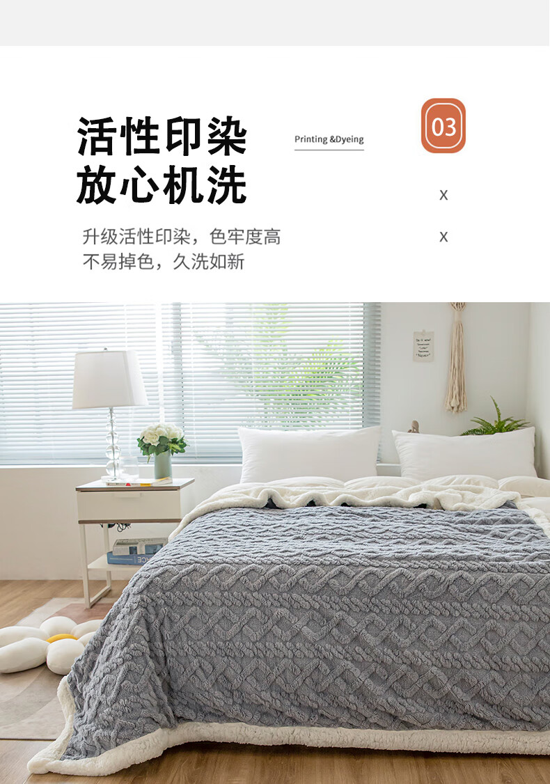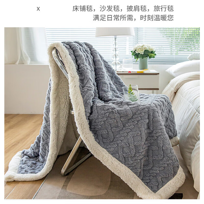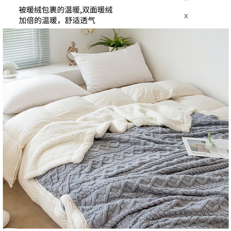 舒适柔软塔芙绒毛毯;双面加绒,加密加厚;高品质克重绒面。一触即暖,一毯多用。
