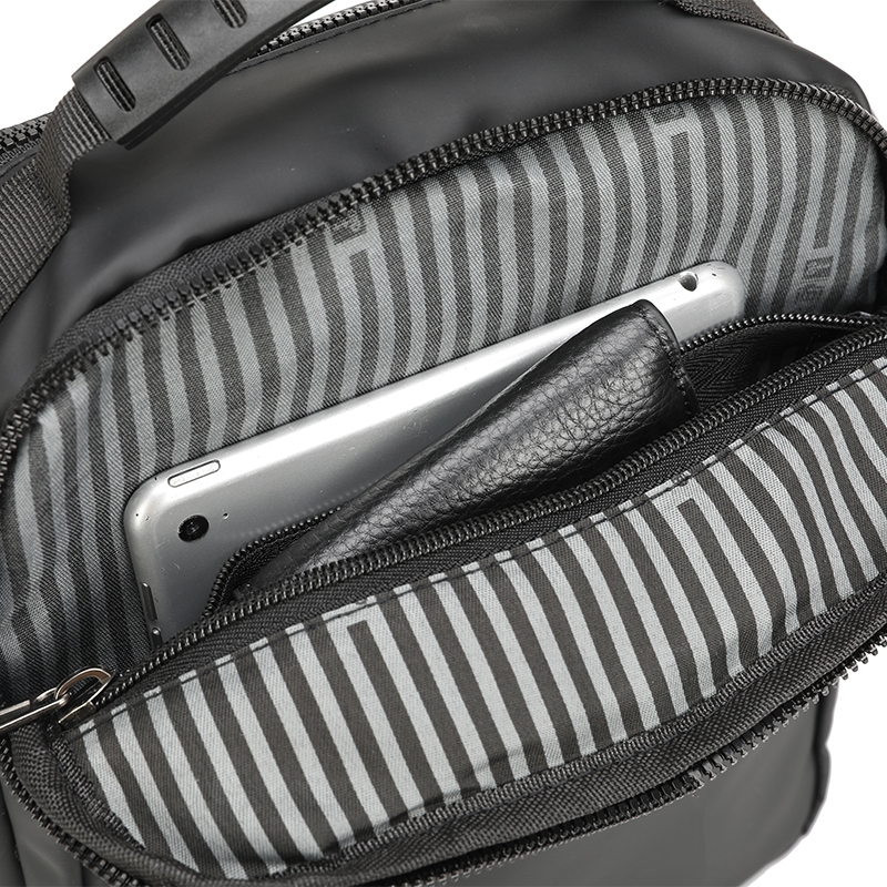 黑色,不朽传奇,低调内涵,潮流休闲;;珠光皮膜材质,防水,表面光泽亮;;内置拉链暗袋、手机插袋,人性化收纳设计;