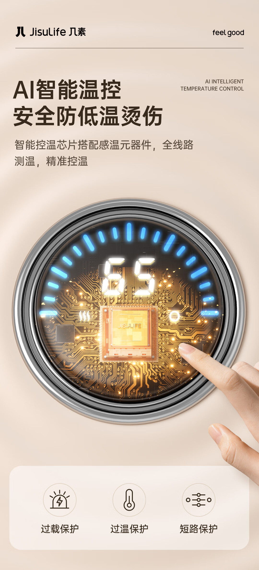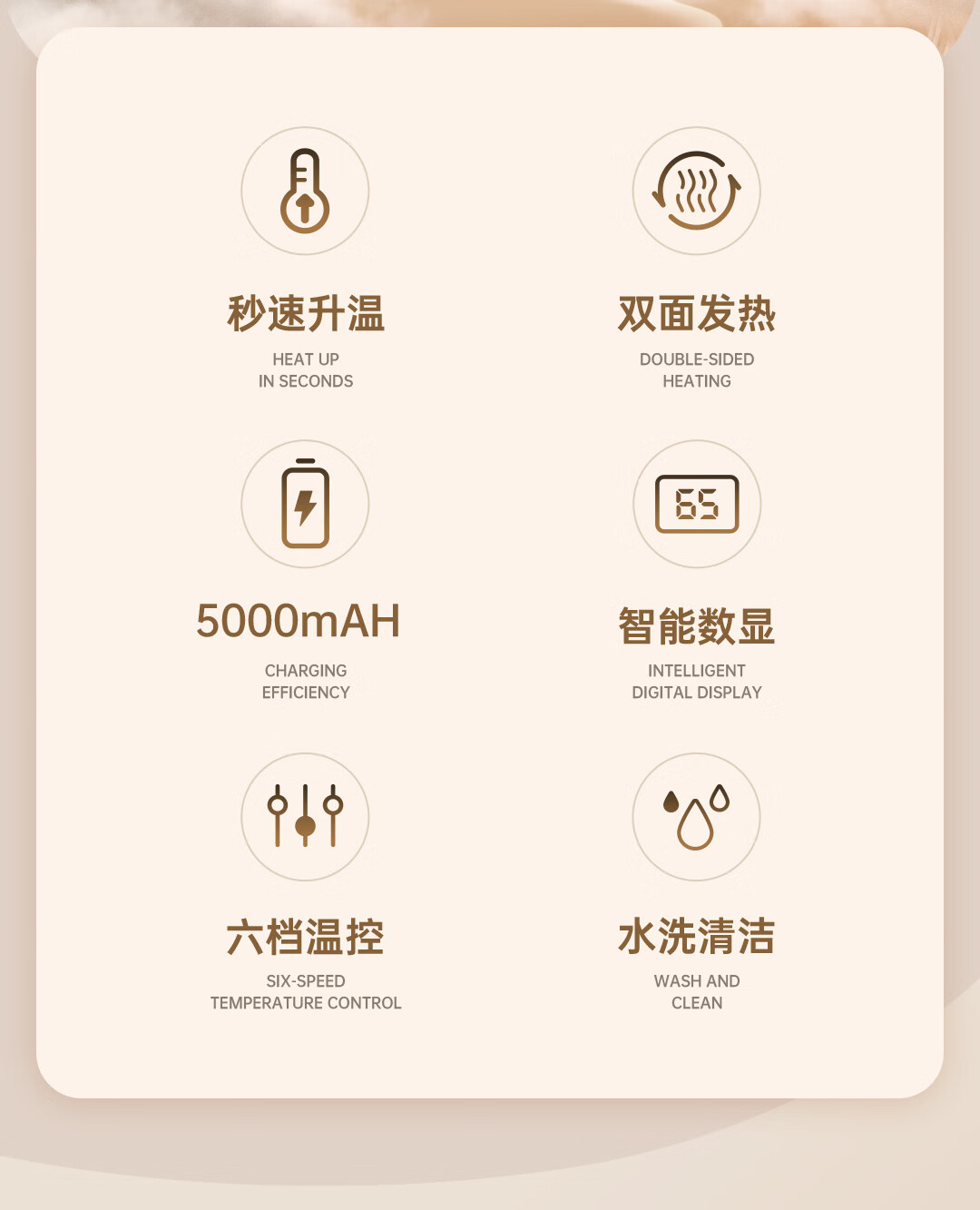 石墨烯发热,六档控温 ;数显温度,水洗清洁;持久锁温,多场景使用