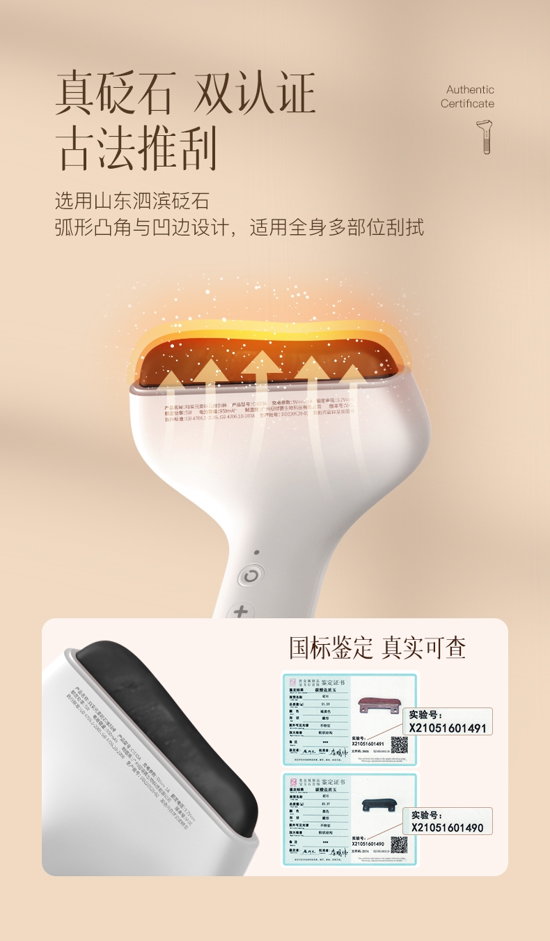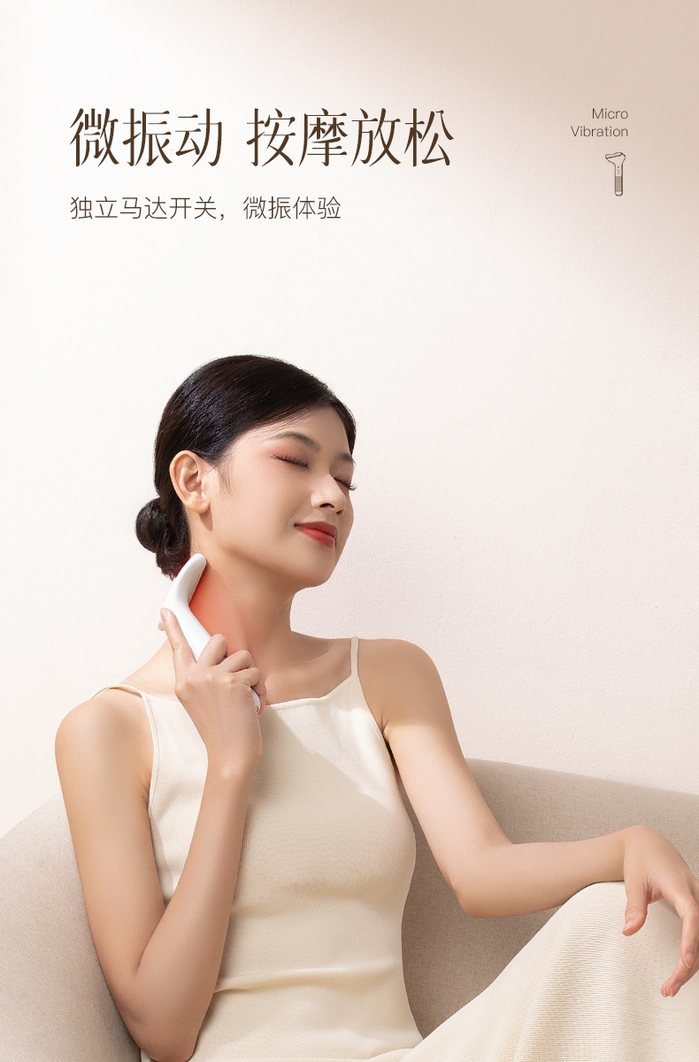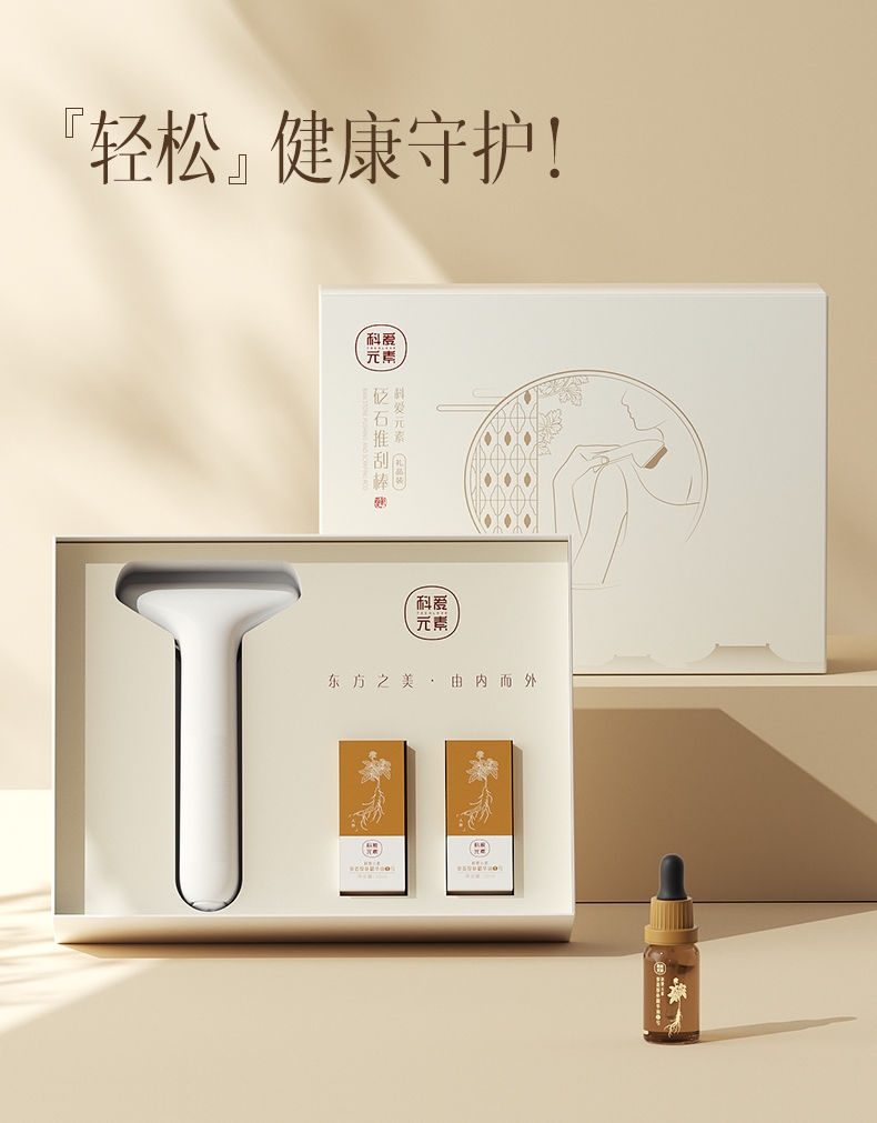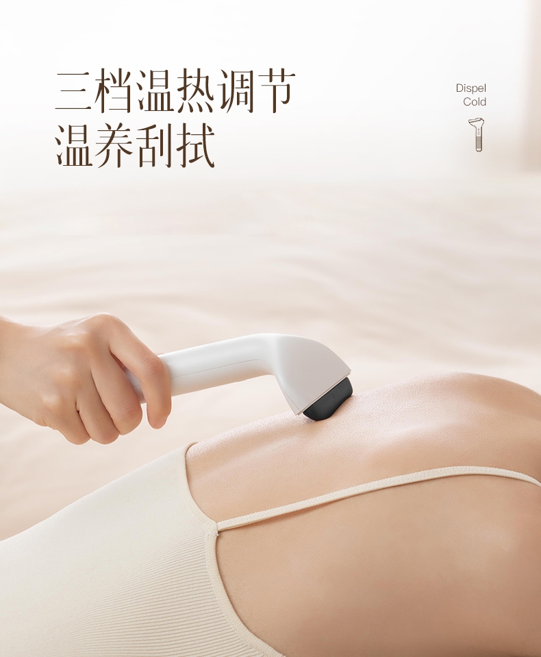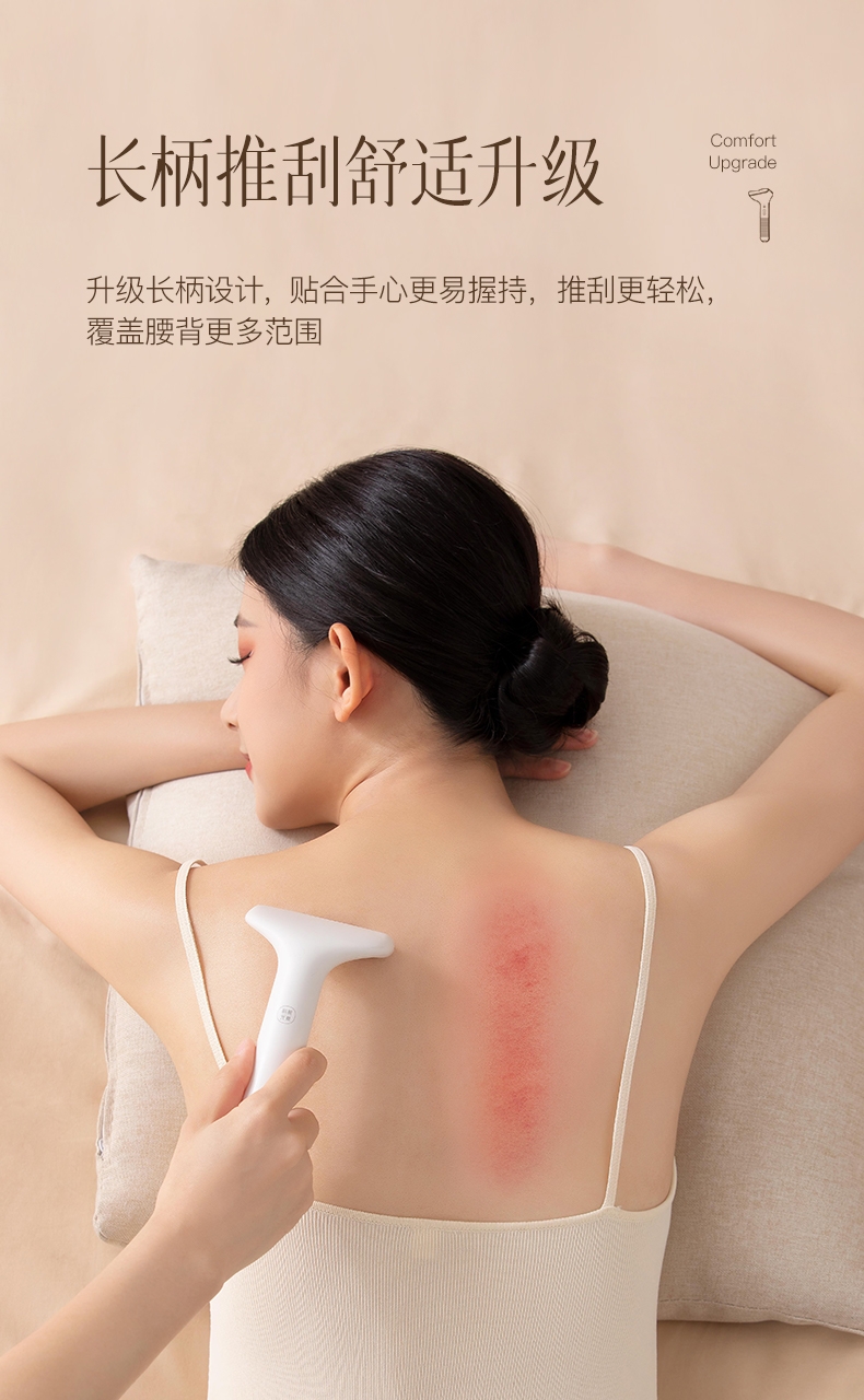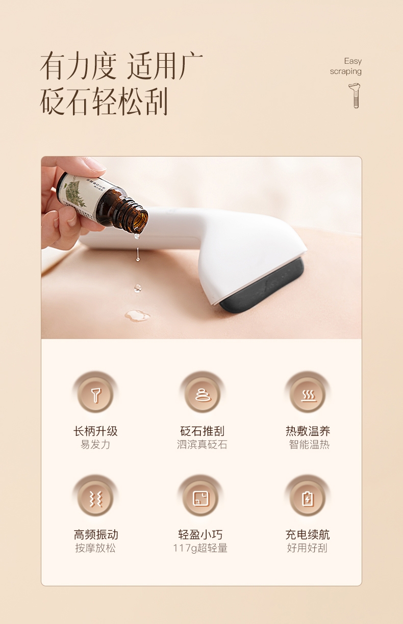 外观设计源于时尚简约风格,长柄设计易握持;三挡温热调节,砭石温灸,高频振动推刮;;轻盈小巧,贴合握持久刮不类、内部采用内置锂电池低压;采用天然泗滨红砭石,刮痧走穴;搭配6瓶蕲艾精油,水感轻薄亲肤,艾草植萃提取。