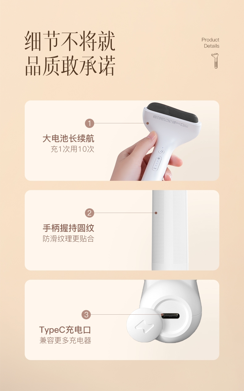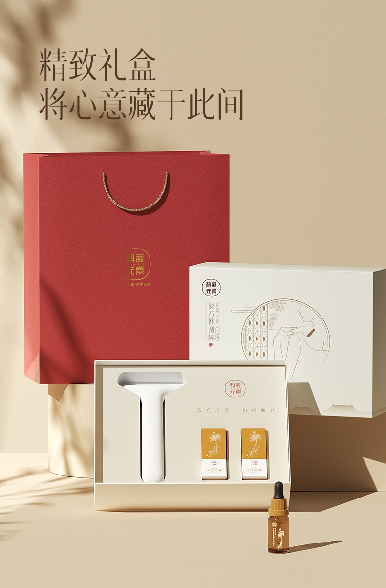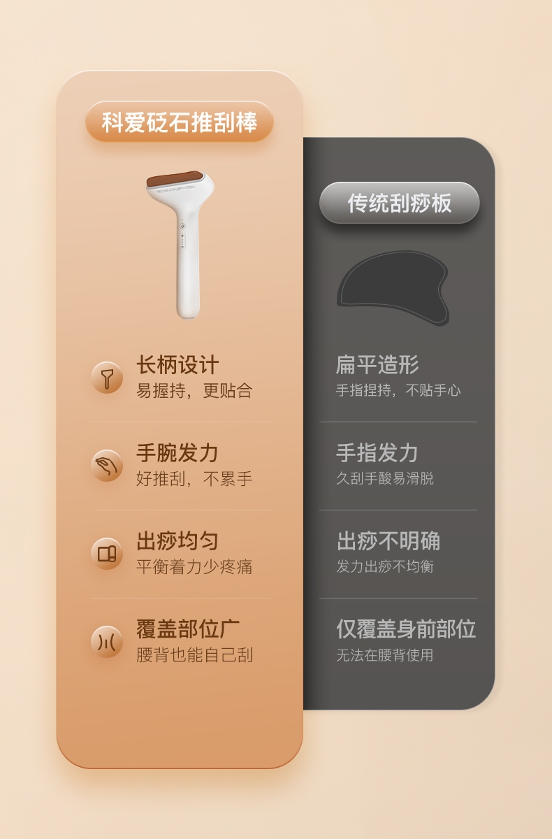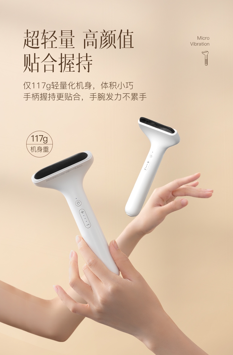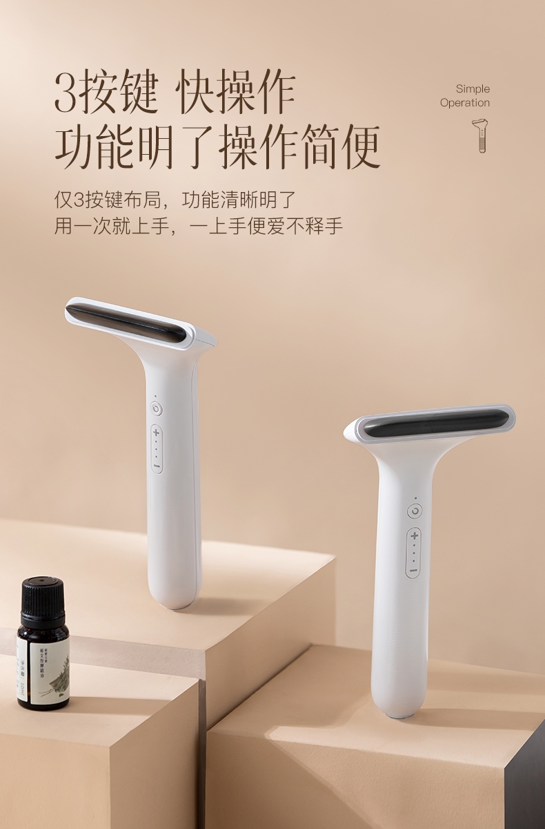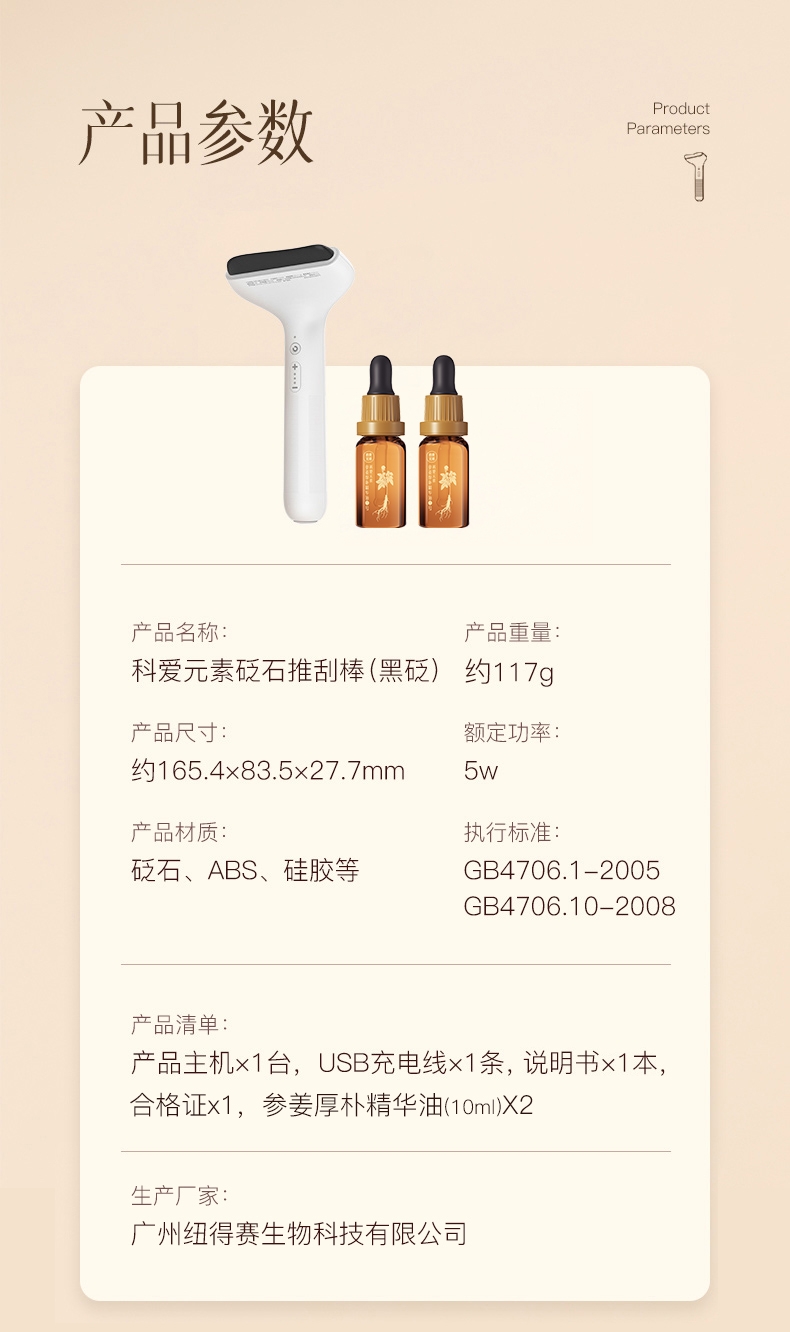外观设计源于时尚简约风格,长柄设计易握持;三挡温热调节,砭石温灸,高频振动推刮;;轻盈小巧,贴合握持久刮不类、内部采用内置锂电池低压;采用天然泗滨红砭石,刮痧走穴;搭配6瓶蕲艾精油,水感轻薄亲肤,艾草植萃提取。