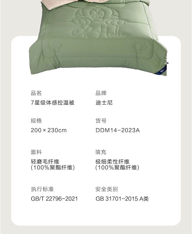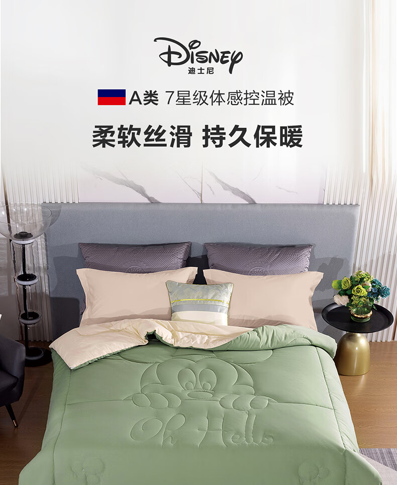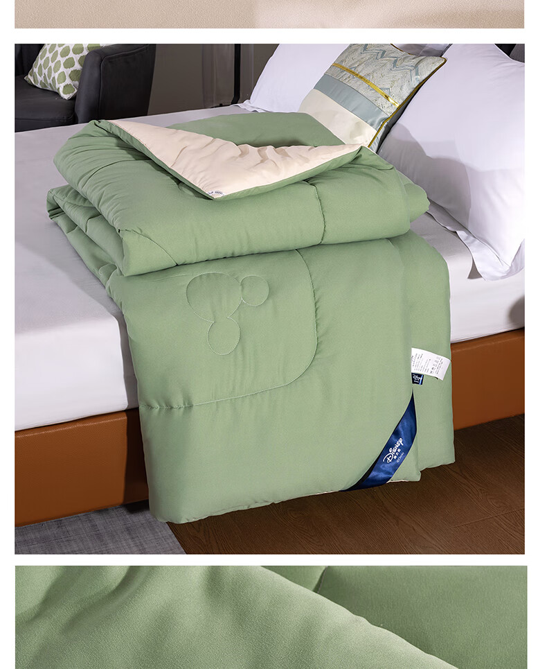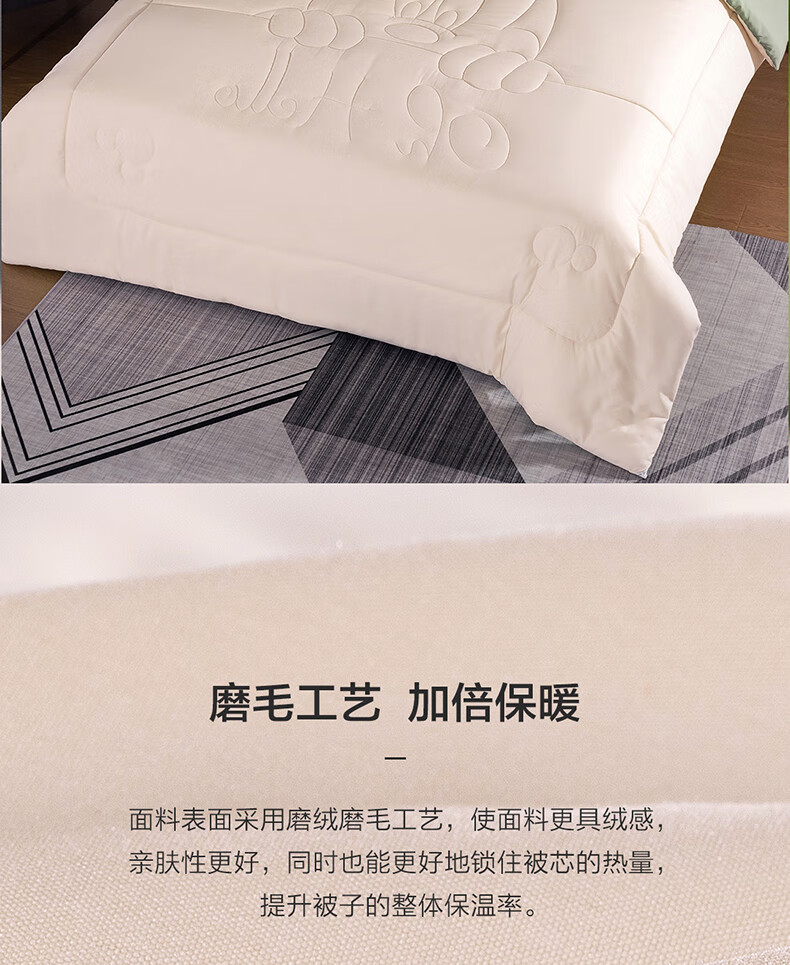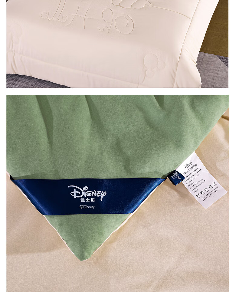 迪士尼全球品质,山东中纺代工·专家级企业,专业级保;在纤维的填充上采用小于10um的极细柔性纤维;特有极细柔性纤维结构,在被芯内部形成热对流;无芳香胺、无甲醛、无荧光剂,A类母婴级呵护,睡的安