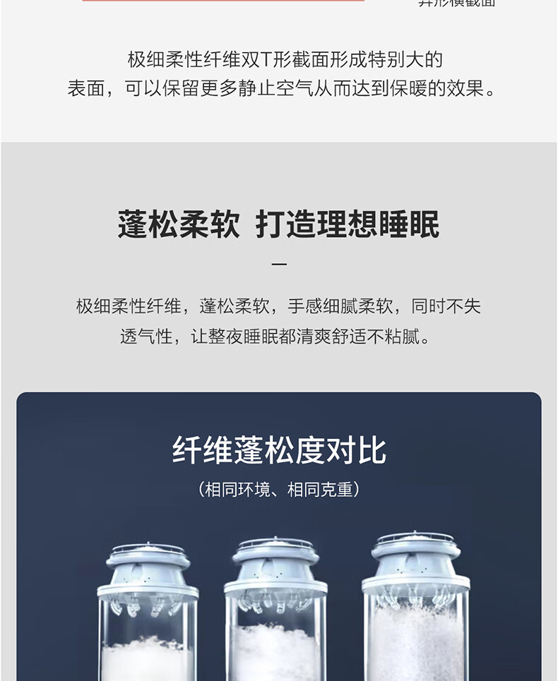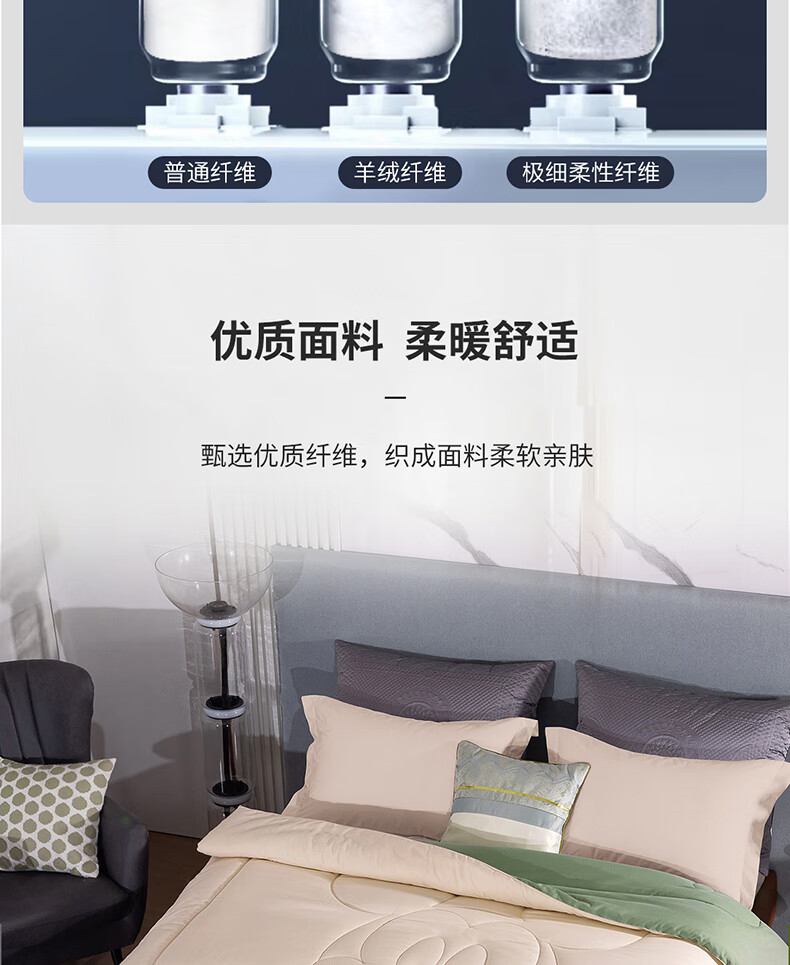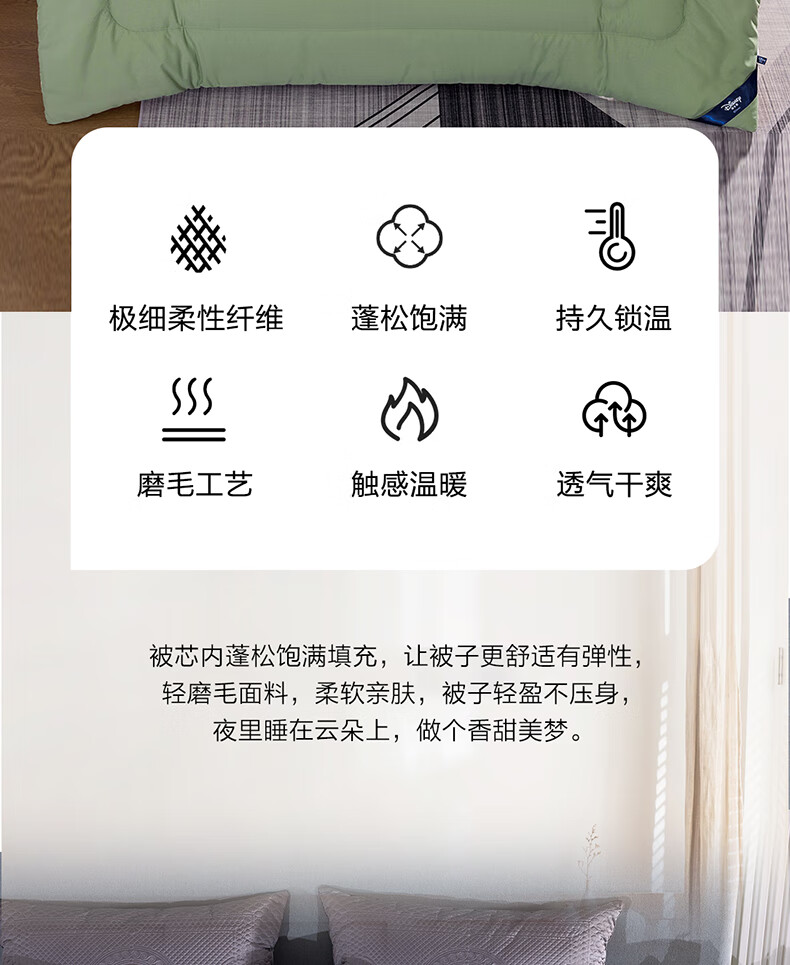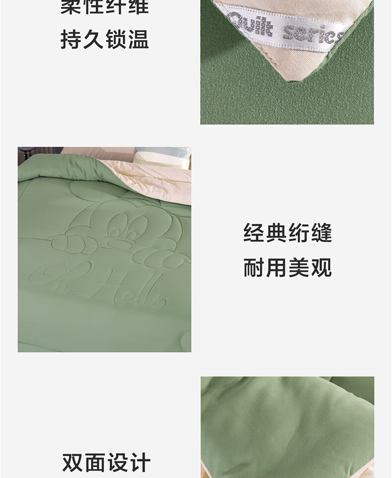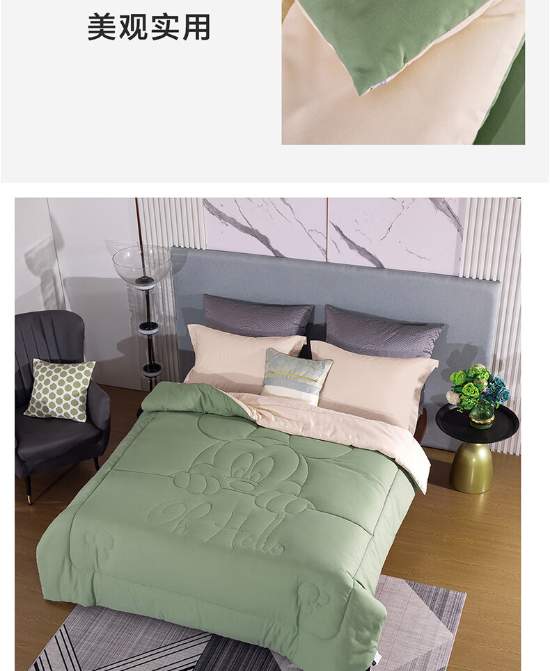 迪士尼全球品质,山东中纺代工·专家级企业,专业级保;在纤维的填充上采用小于10um的极细柔性纤维;特有极细柔性纤维结构,在被芯内部形成热对流;无芳香胺、无甲醛、无荧光剂,A类母婴级呵护,睡的安