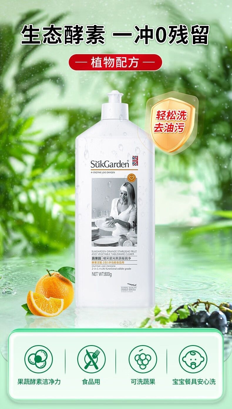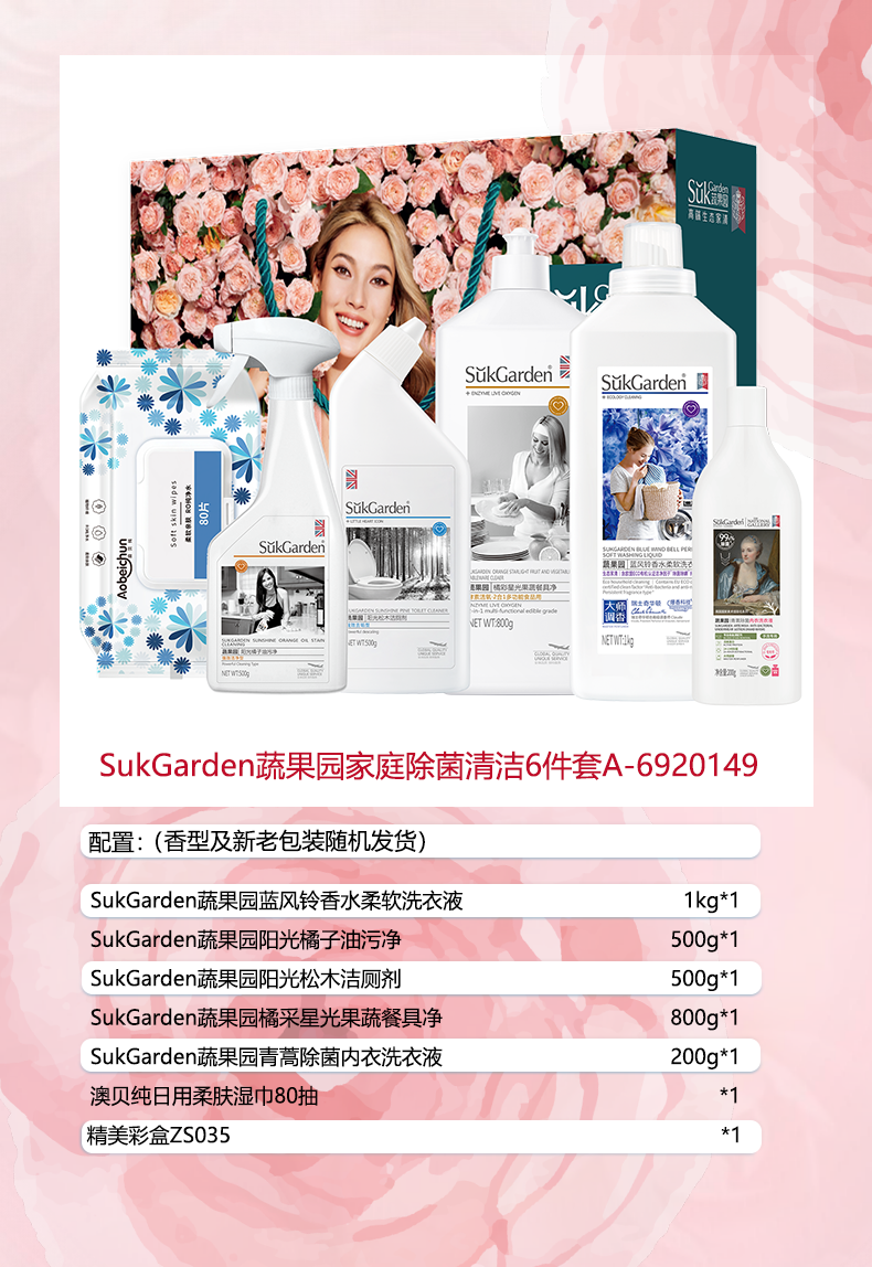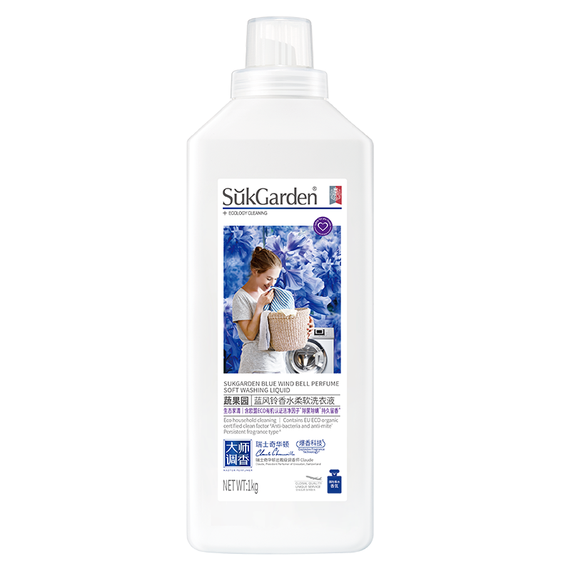 配置:SukGarden蔬果园蓝风铃香水柔软洗衣液(持久留香)1kg*1(零售价49元) SukGarden蔬果园青蒿除菌内衣洗衣液(内衣专用)200g*1(零售价19.9元) SukGarden蔬果园橘采星光果蔬餐具净(食用级安全无残留)800g*1(零