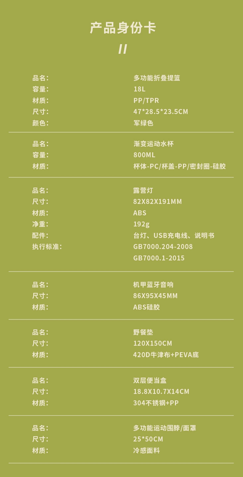 多功能折叠提篮 自带桌板|折叠设计|健康材质;户外露营灯 三档色温|无极调光|持久续航|皮质手提;双层便当盒 健康材质|分格设计|密封便携;多功能运动围脖/面罩 冷感面料|快速吸汗|多场景运;户外迷你蓝牙音响 轻薄小巧|360°环绕声|蓝牙5