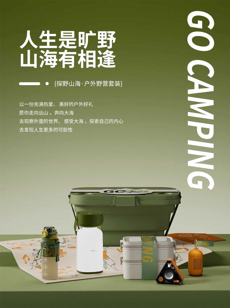 礼盒配置:多功能折叠提篮(桌板)*1 渐变运动水杯* 1、露营灯* 1 便当盒* 1、蓝牙音响*1 多功能运动围脖/面罩* 1、野餐垫*1
