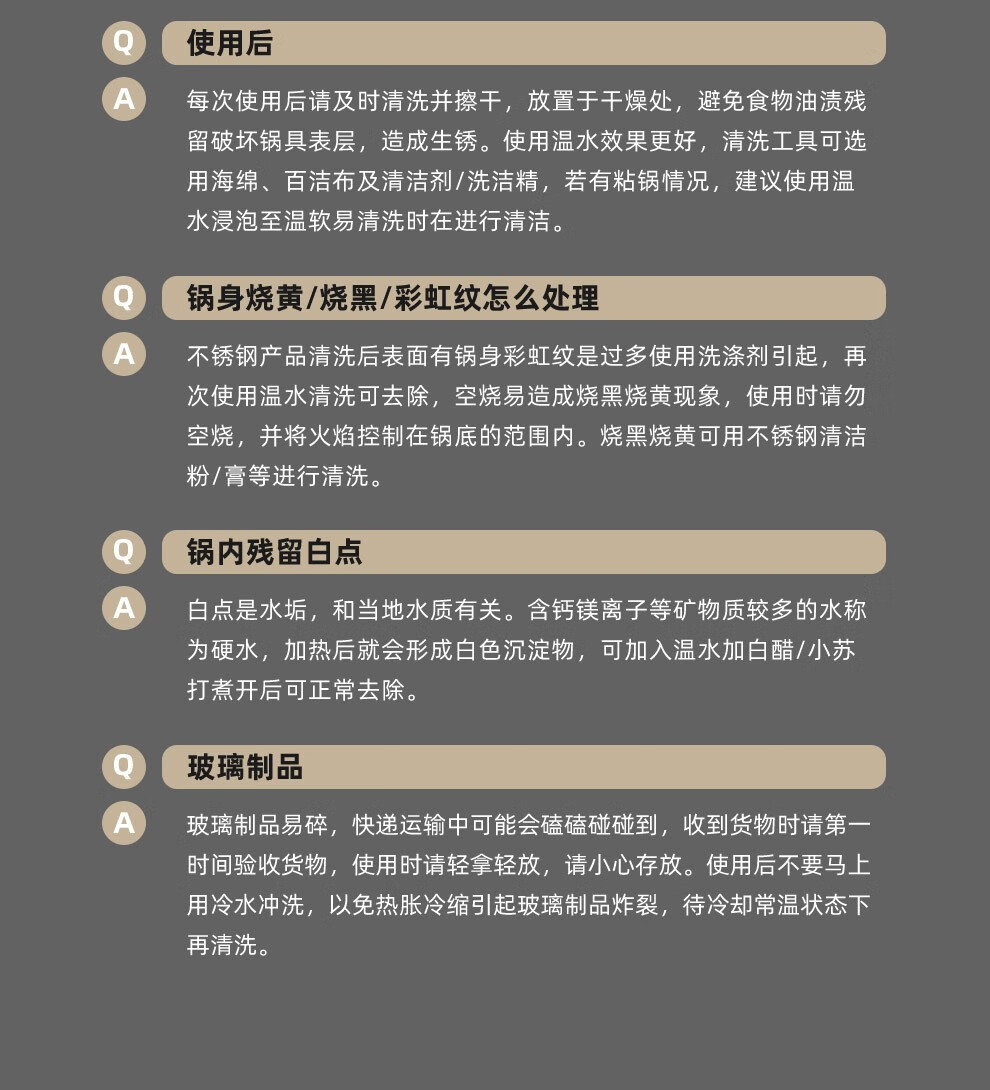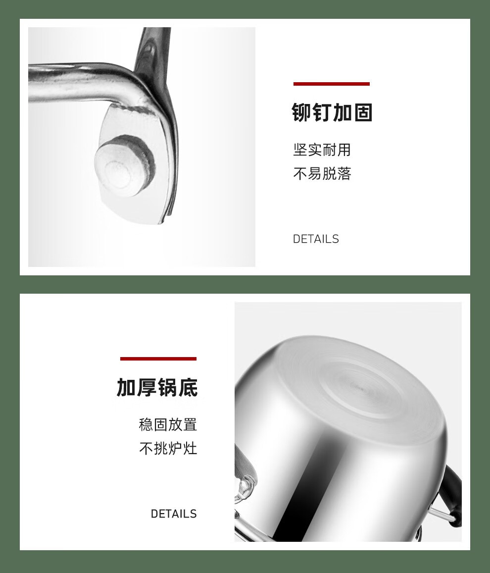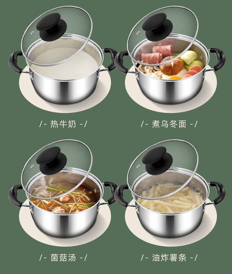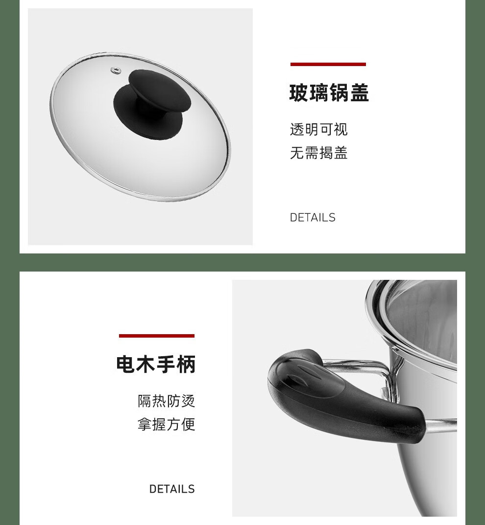 锅盖采用钢化玻璃与优质钢材组合而成;电木手柄,有效的防止热传递,手感舒适;任何炉具皆可使用