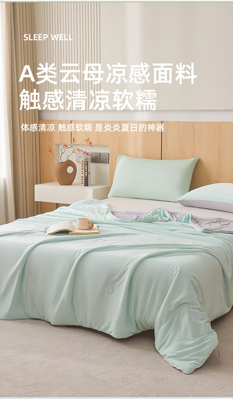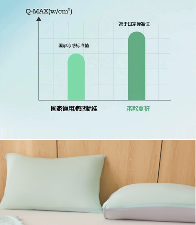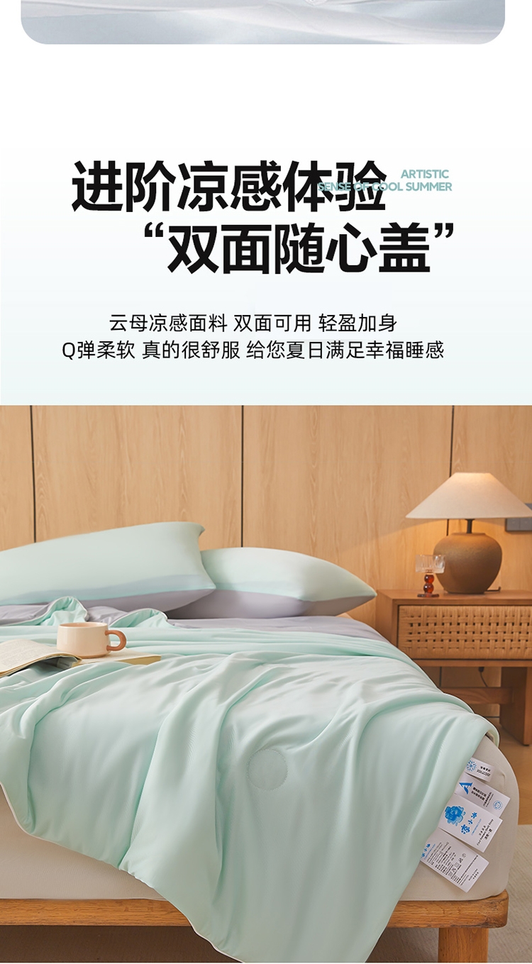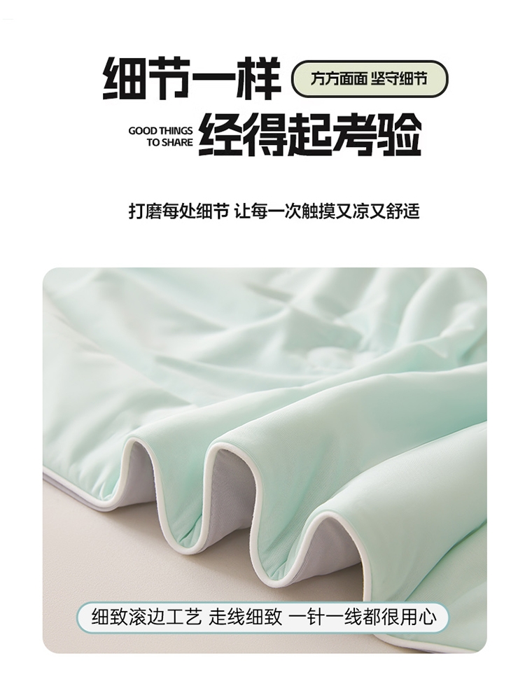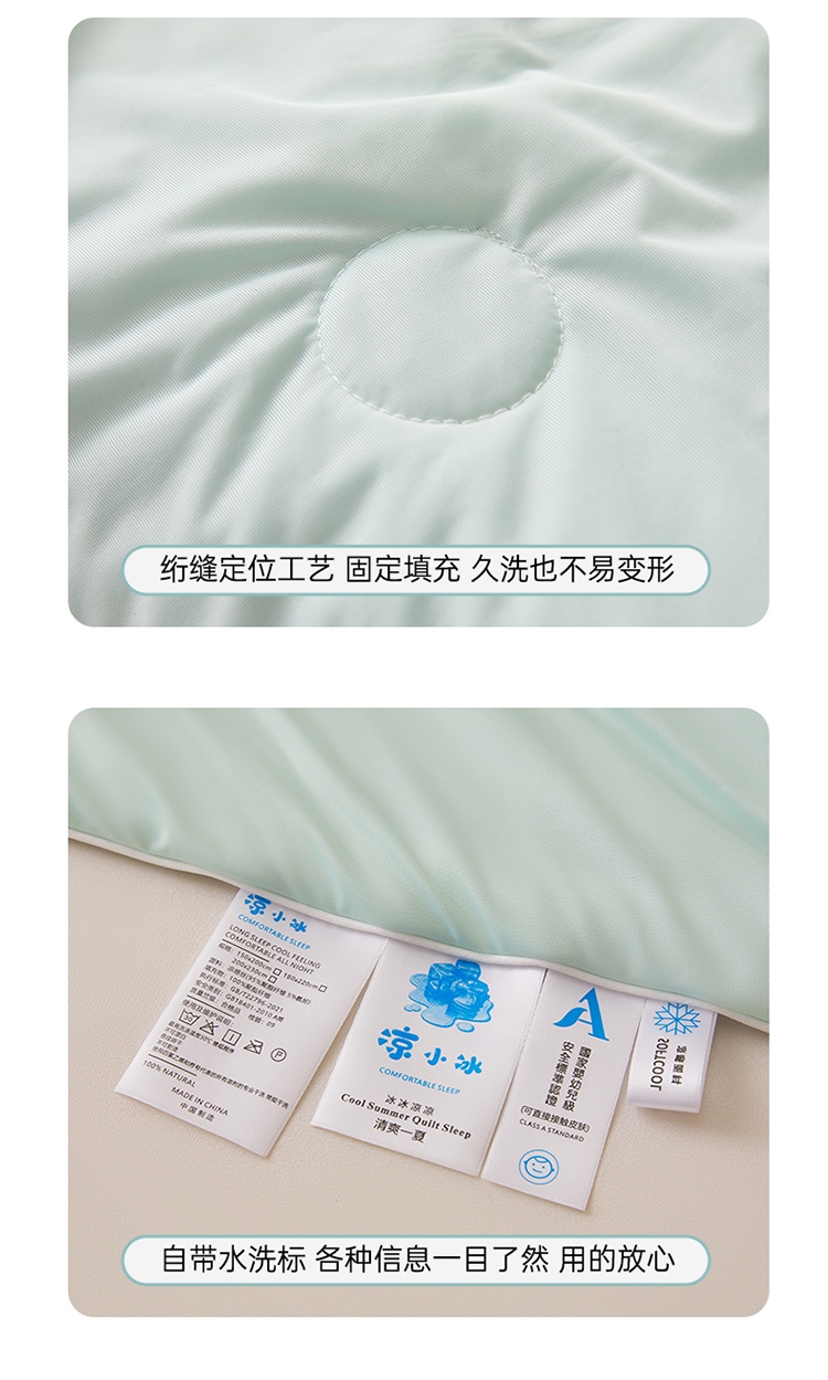 A类凉感丝面料 0甲醛 0 荧光剂 0芳香胺;拥有较好的柔软性透气性,吸水性;精致绗缝,可手洗可机洗