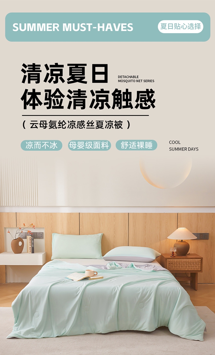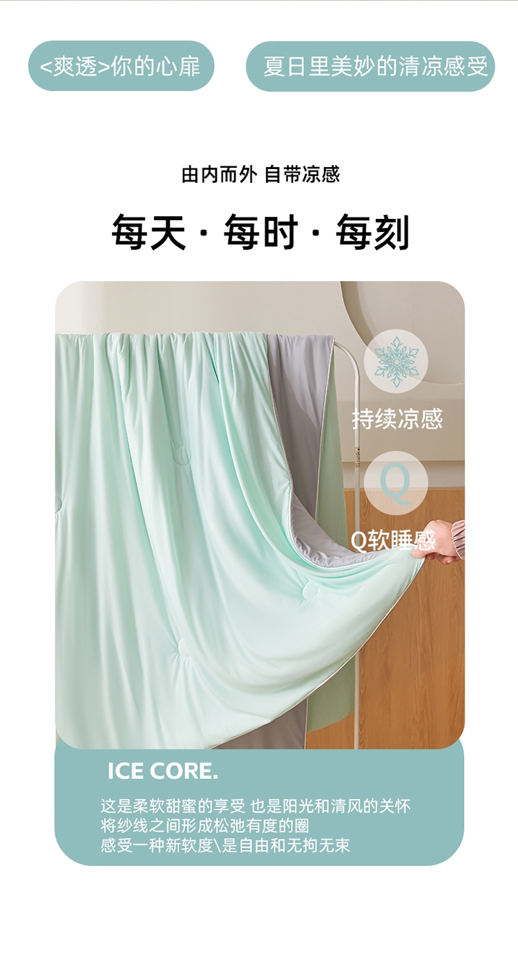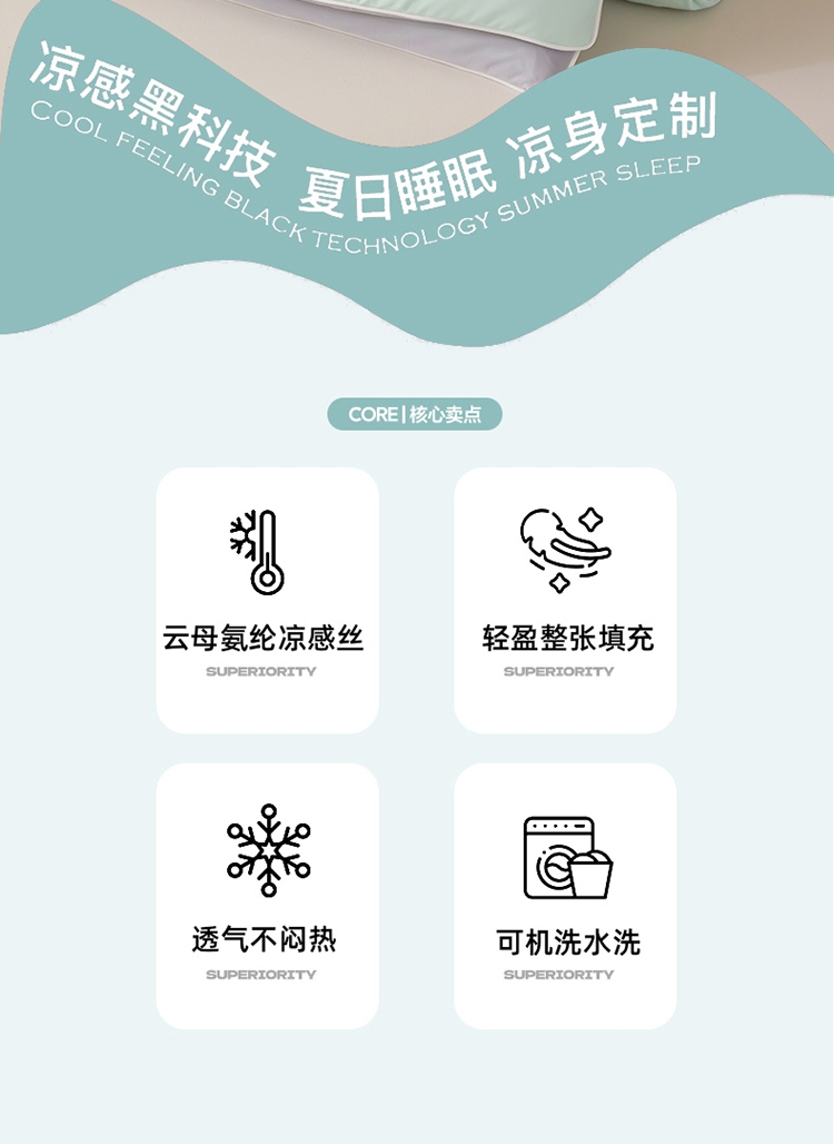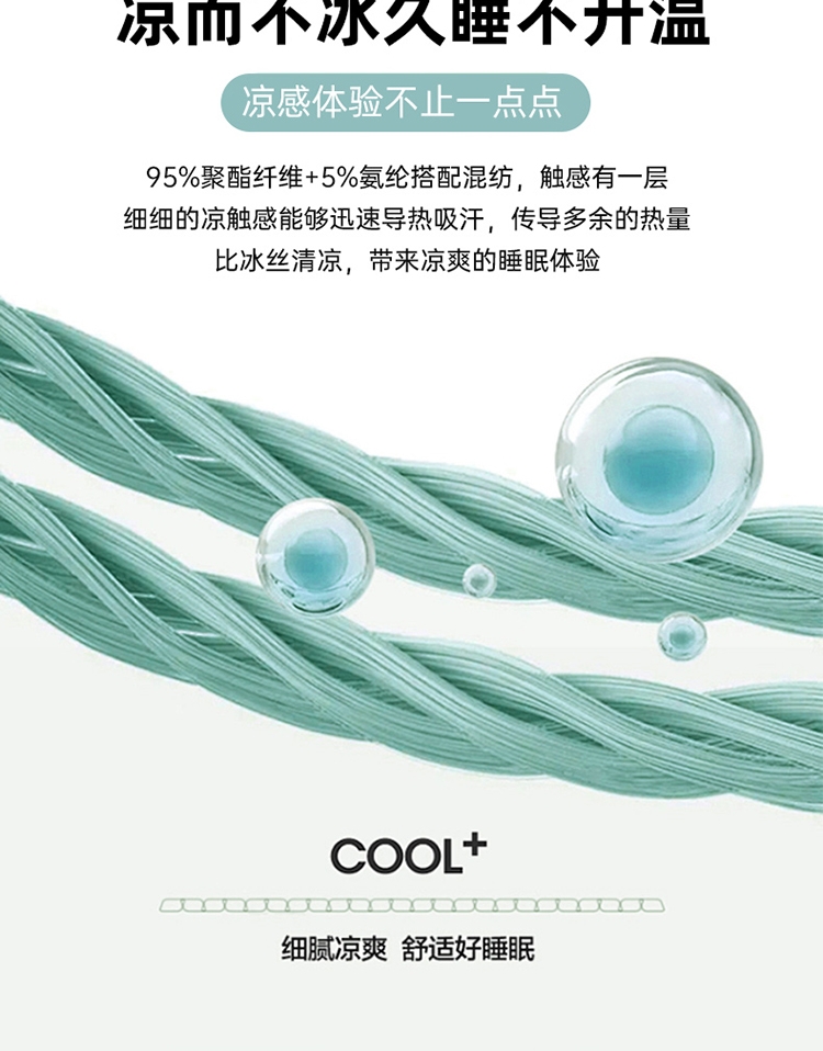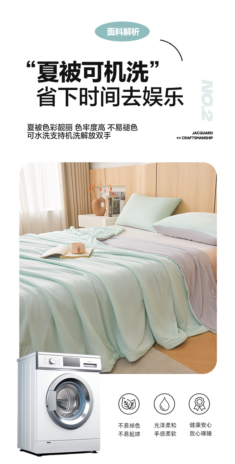 A类凉感丝面料 0甲醛 0 荧光剂 0芳香胺;拥有较好的柔软性透气性,吸水性;精致绗缝,可手洗可机洗