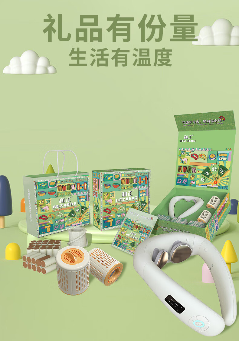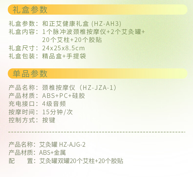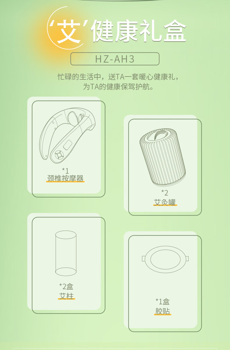 健康套装,由1个脉冲波颈椎按摩仪+2个艾灸罐组成:;和正颈椎按摩仪采用EMS脉冲、中频技术,仿人手按摩;五大按摩模式十档按摩力度可调,使用更随心;