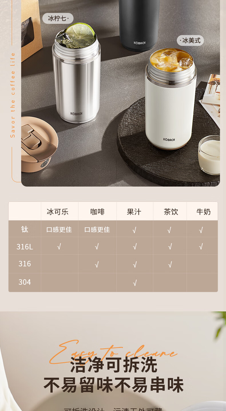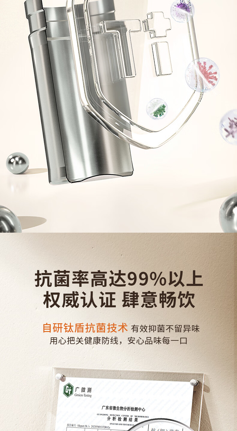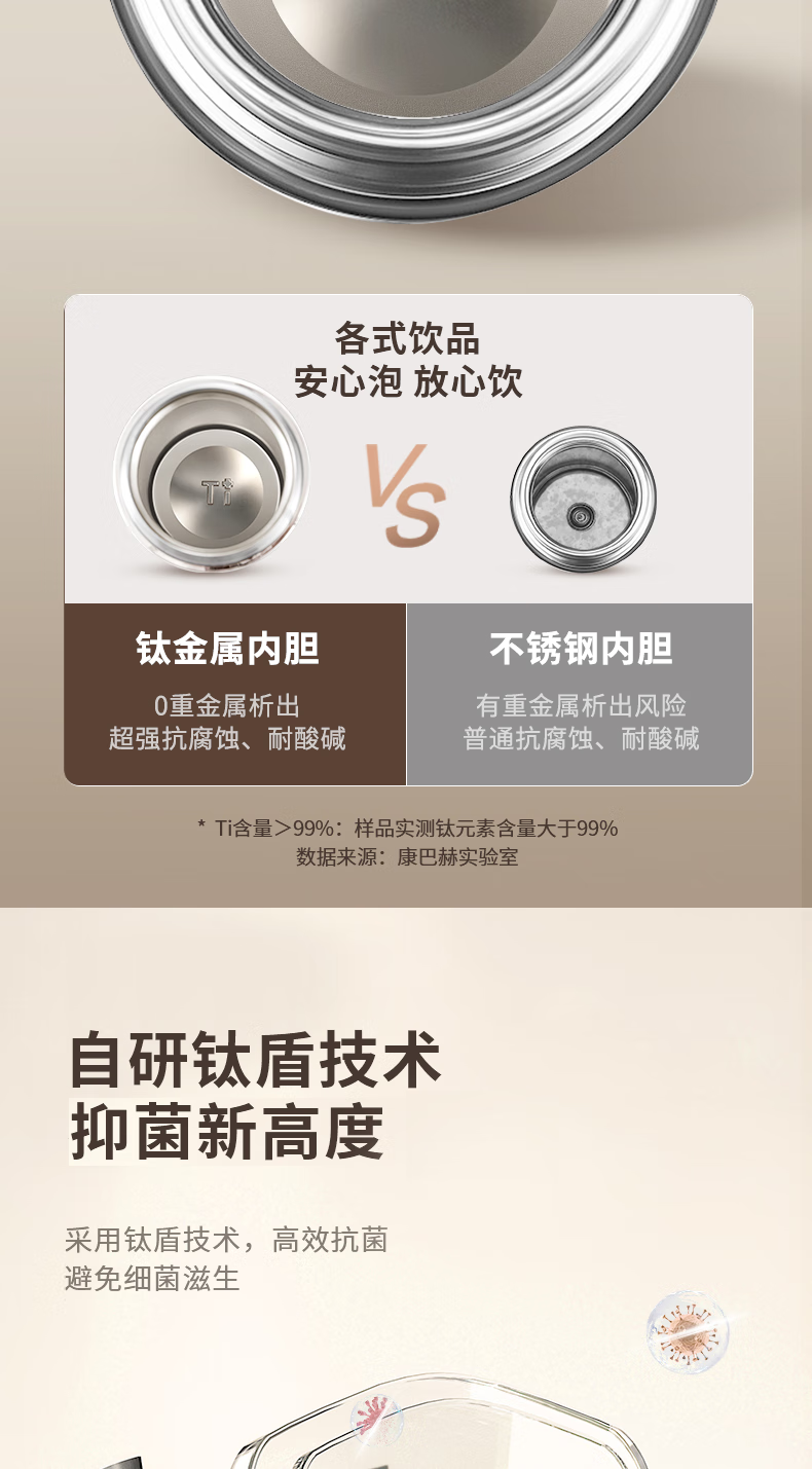 采用100%钛板材内胆,0涂层,0重金属析出;无惧酸碱,抗腐蚀,无惧高温久泡,守护身体健康;防漏硅胶圈,360度防漏设计,出行携带不怕漏;创意三合一三用杯盖,吸管/直饮/敞口不设限;6小时保温保冷,可提可背,百搭携带方式