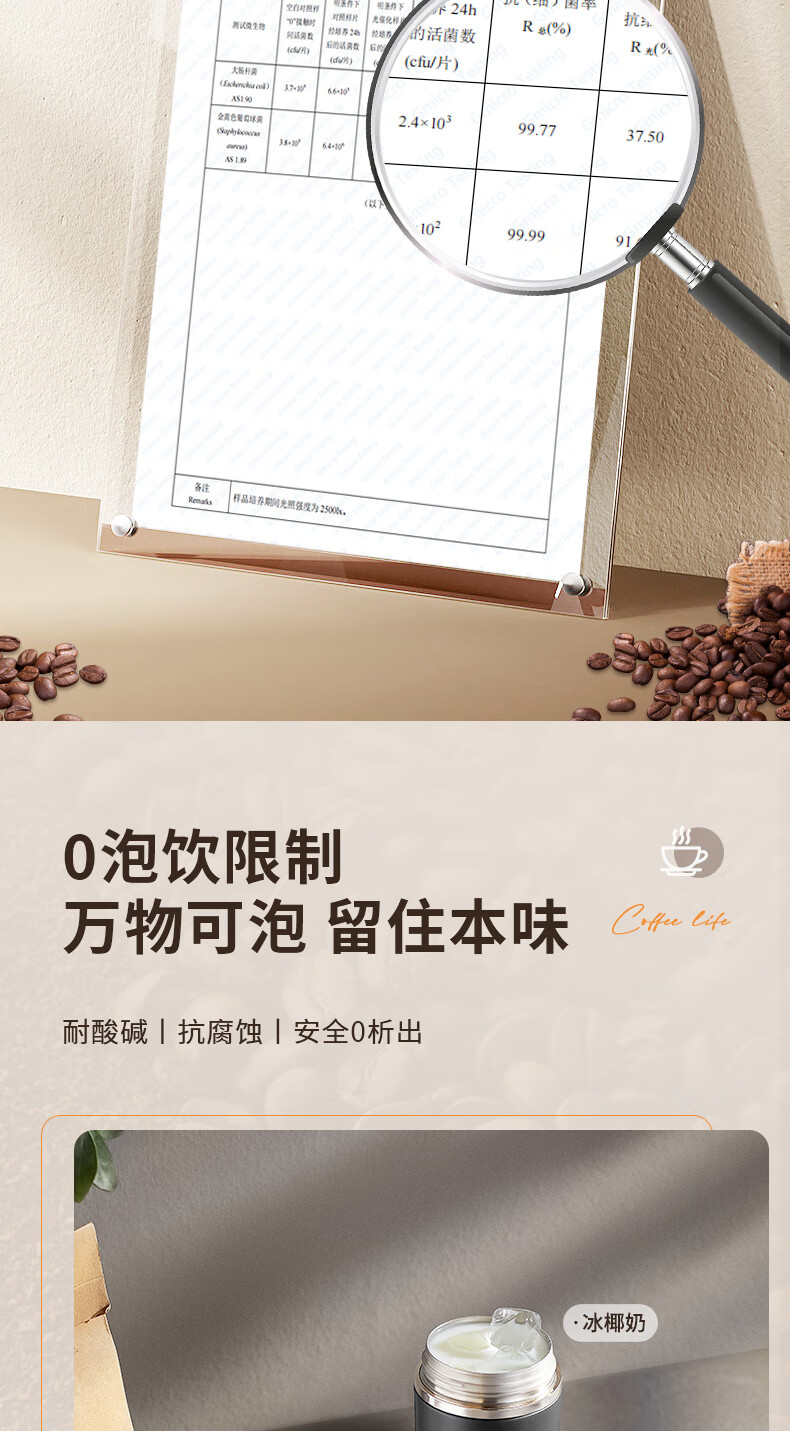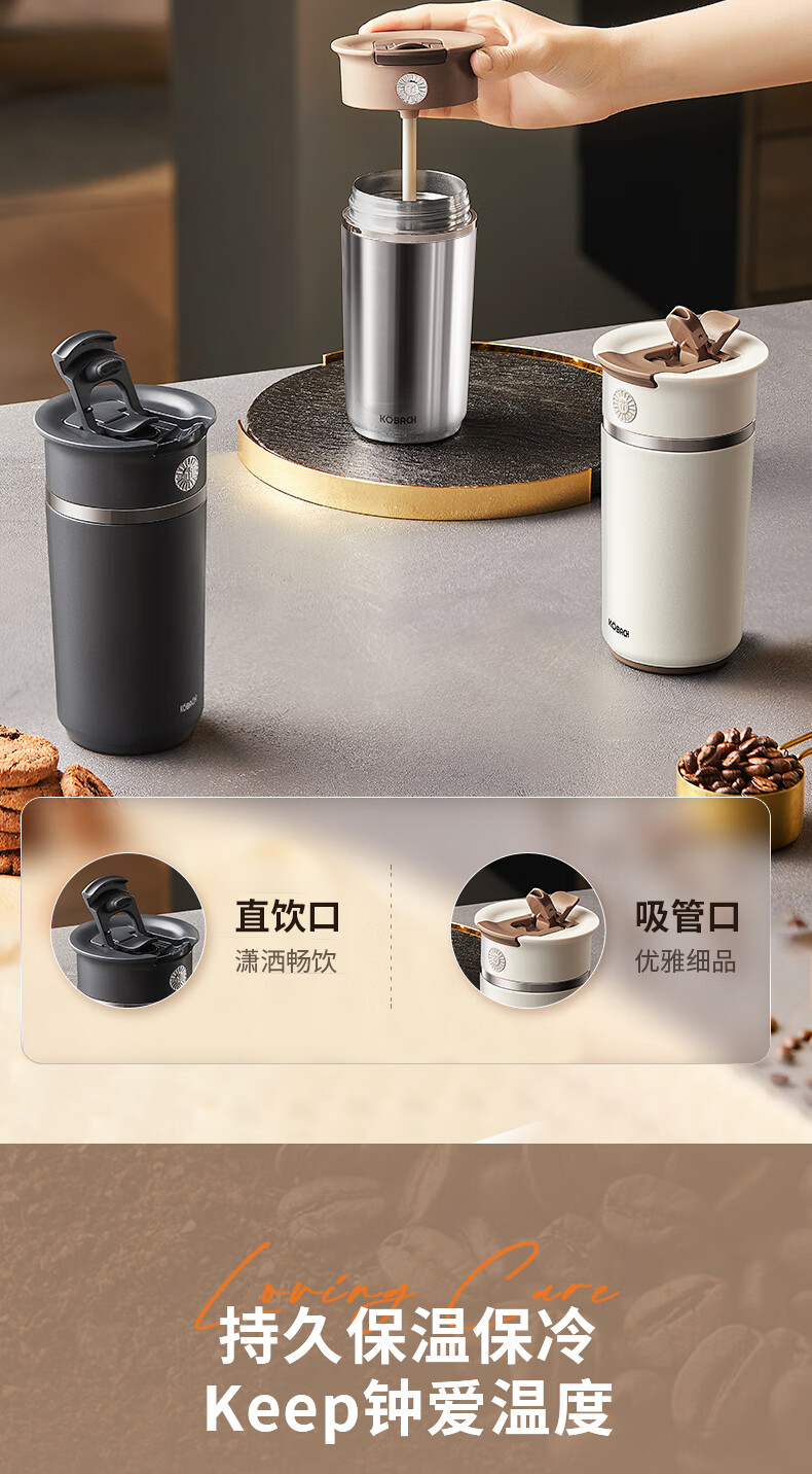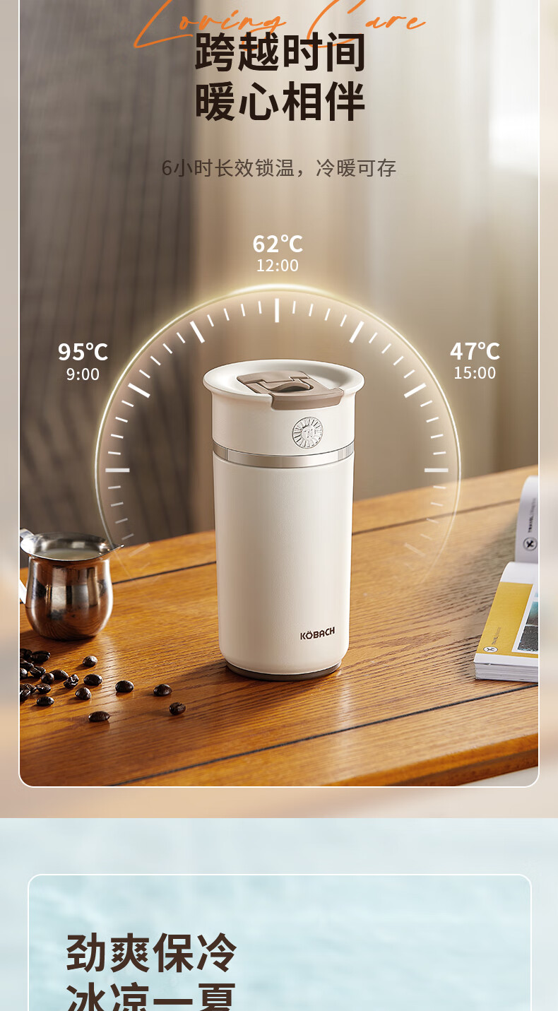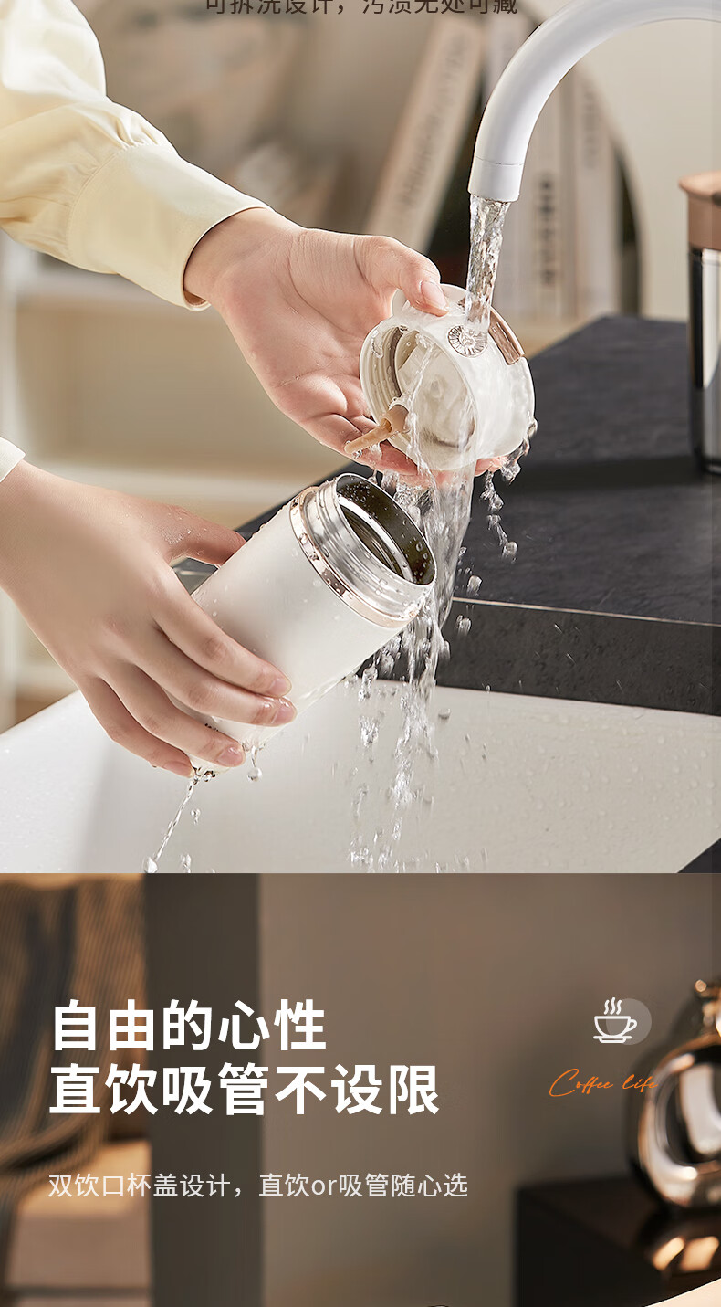 采用100%钛板材内胆,0涂层,0重金属析出;无惧酸碱,抗腐蚀,无惧高温久泡,守护身体健康;防漏硅胶圈,360度防漏设计,出行携带不怕漏;创意三合一三用杯盖,吸管/直饮/敞口不设限;6小时保温保冷,可提可背,百搭携带方式