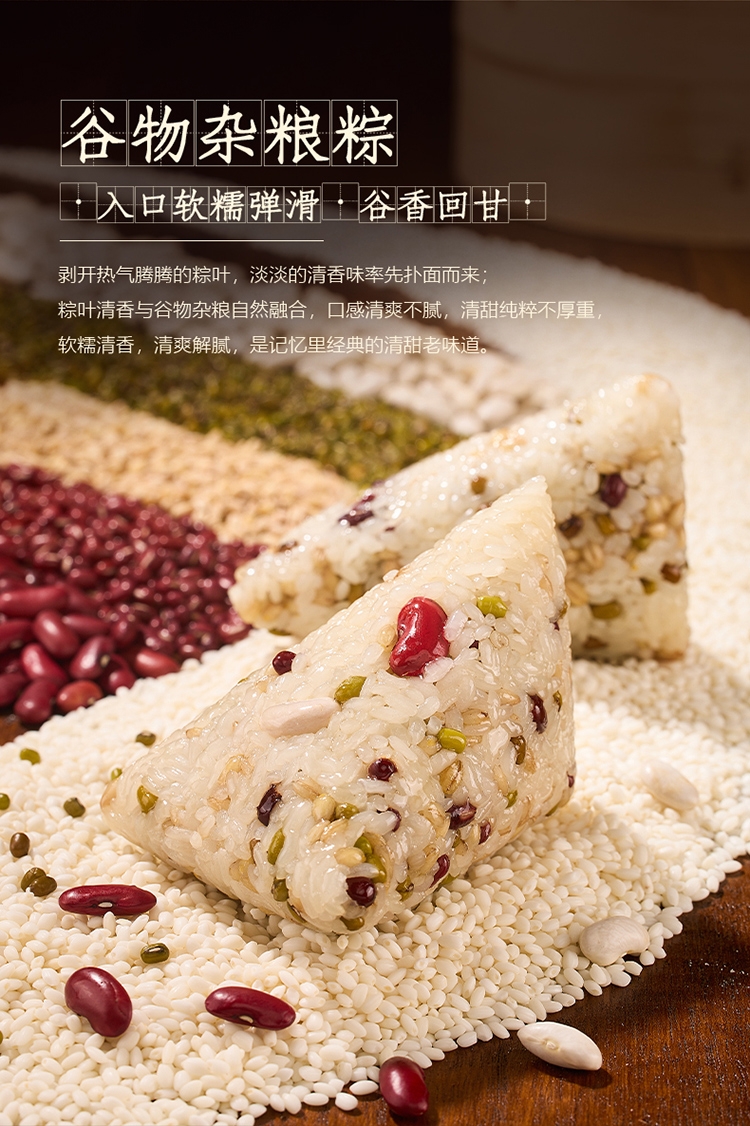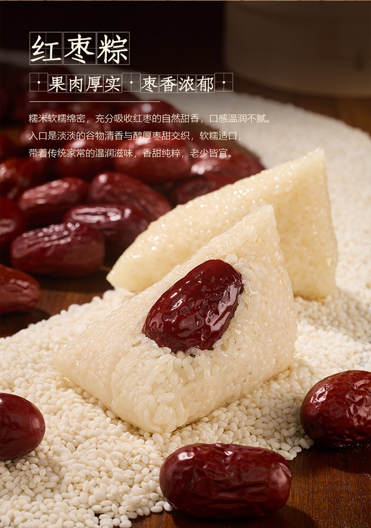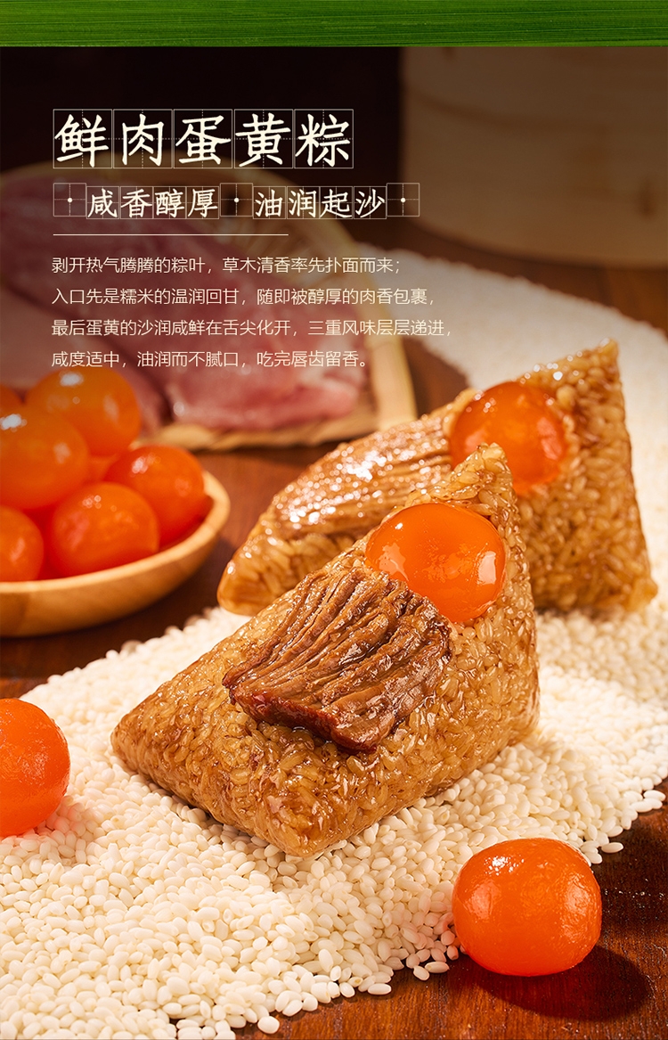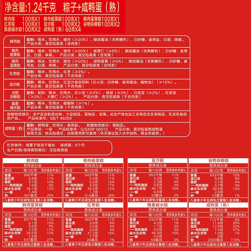 内容物:鲜肉蛋黄粽 100g *1 鲜肉板栗粽 100g *1 鲜肉粽 100g *1 红枣粽 100g *1 豆沙粽 100g* 2 谷物杂粮粽 100g *2 飘香碱水粽 100g *2 咸鸭蛋(4个装60g/个) 240g 1盒