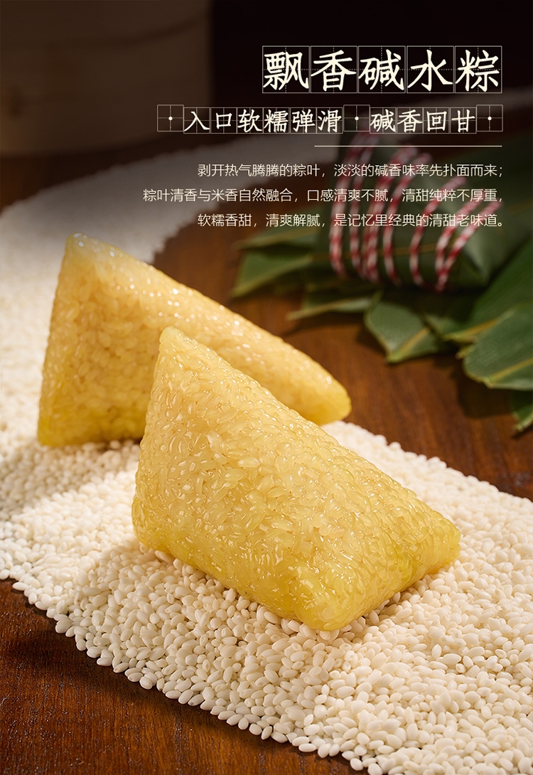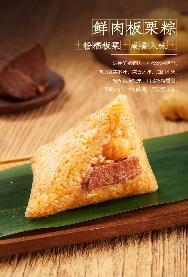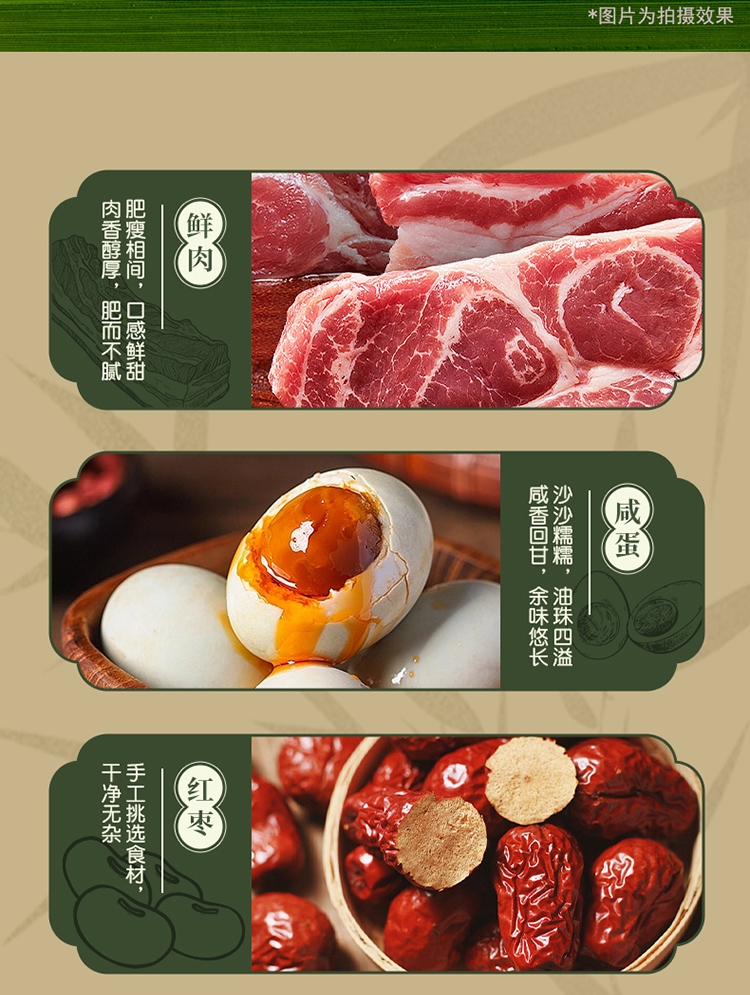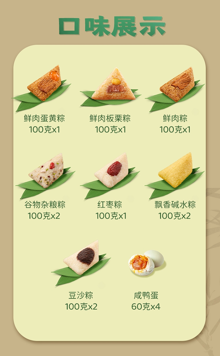 配置清单:鲜肉蛋黄粽 100g *1 鲜肉板栗粽 100g *1 鲜肉粽 100g *1 红枣粽 100g *1 豆沙粽 100g* 2 谷物杂粮粽 100g *2 飘香碱水粽 100g *2 咸鸭蛋(4个装60g/个) 240g 1盒