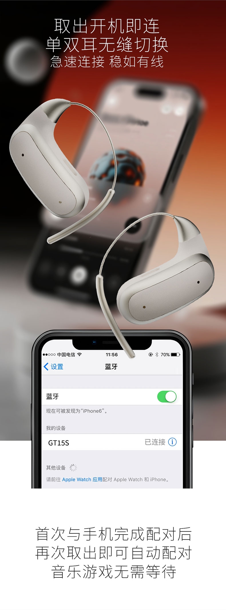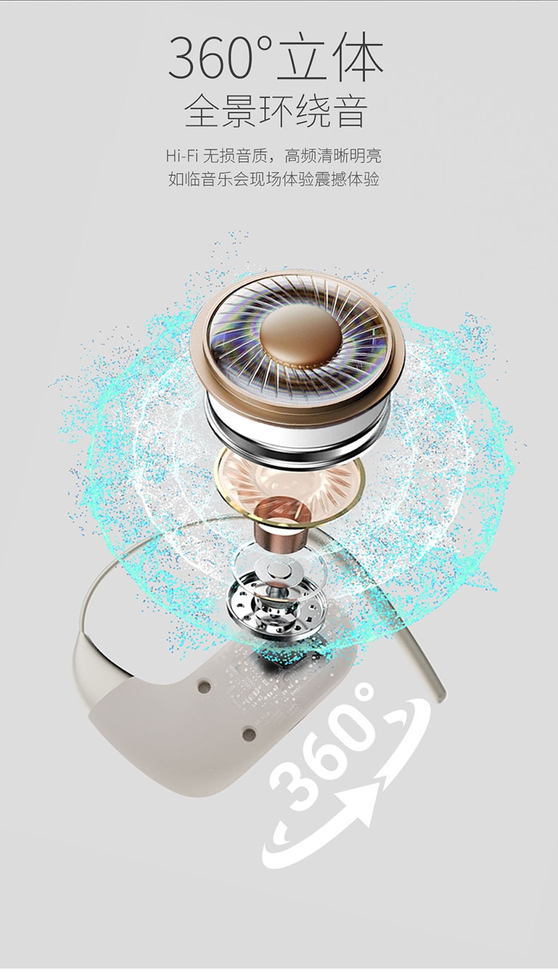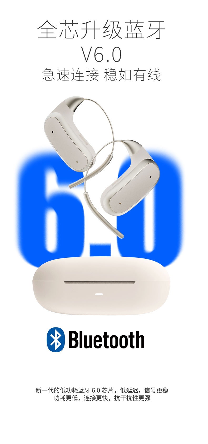 航空记忆钛丝、不仅舒适而且稳固;360°立体、全景环绕音、Hi-Fi无损音质;全芯升级蓝牙V6.0、急速连接 稳如有线;精准传音、不漏音、灵感耳挂,贴合耳道;低延时,轻松听声辩位,燃嗨全场,畅快游戏