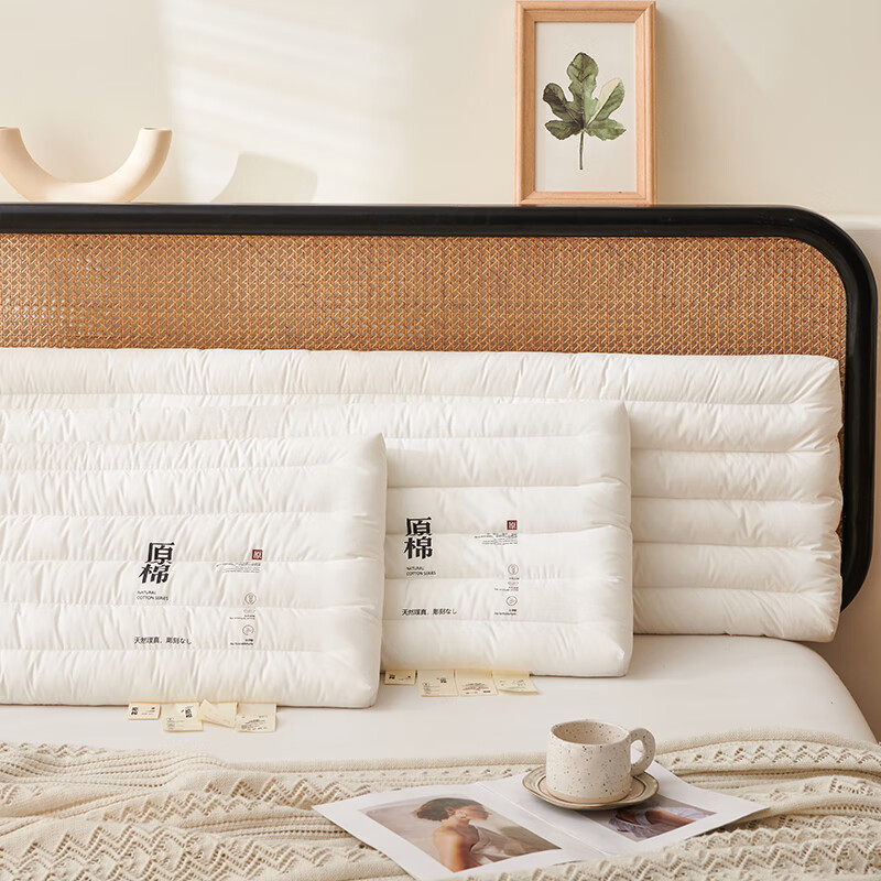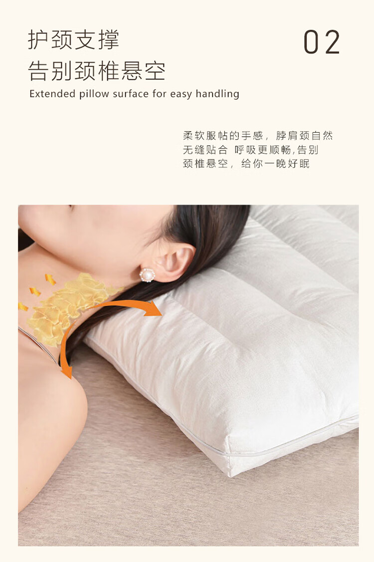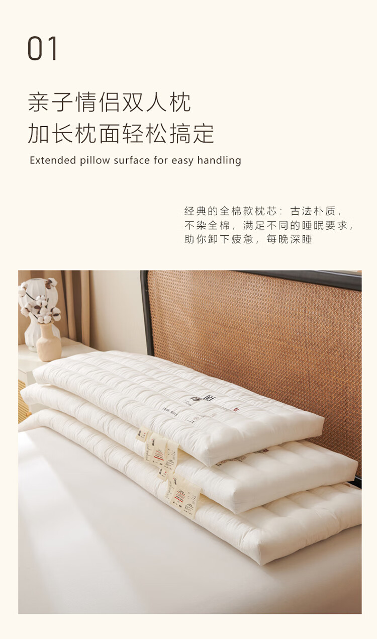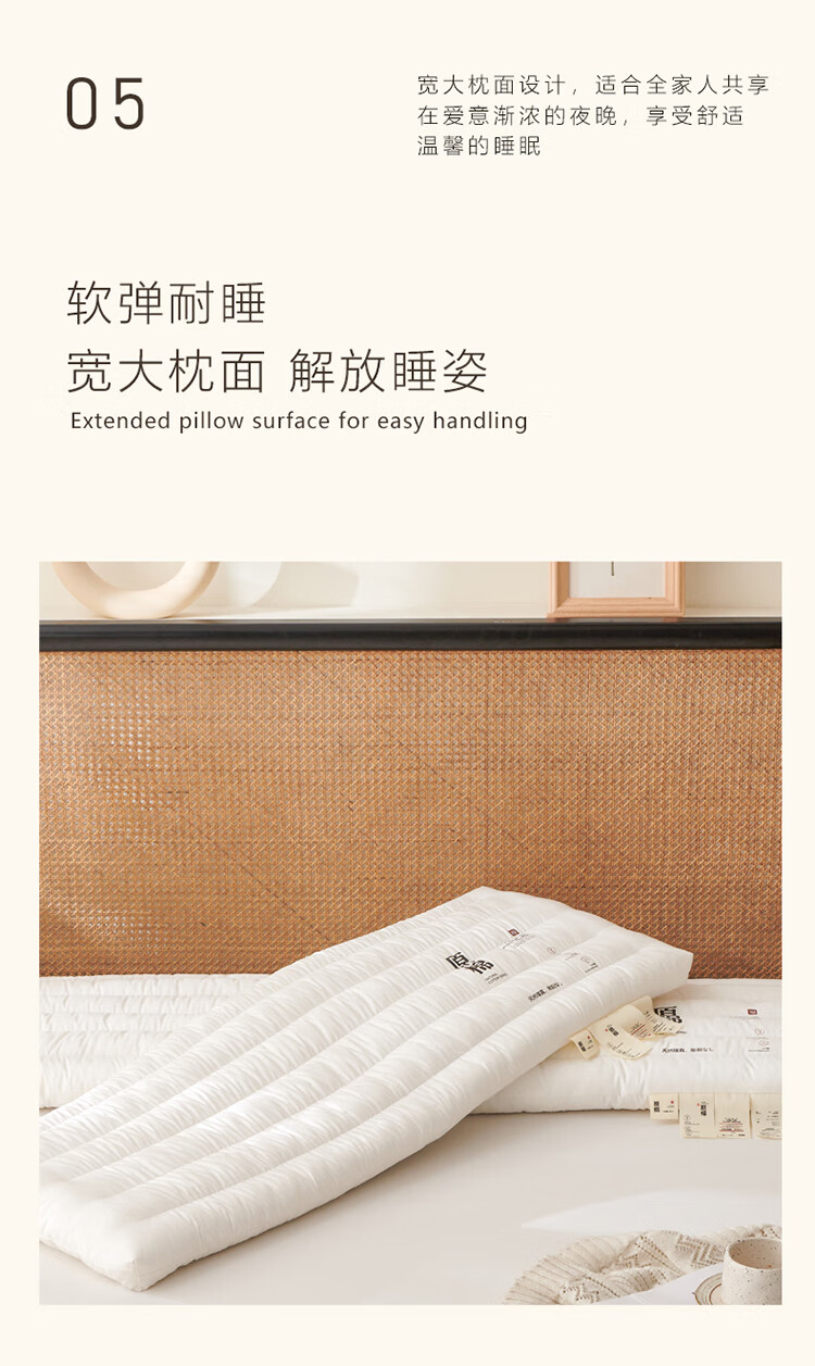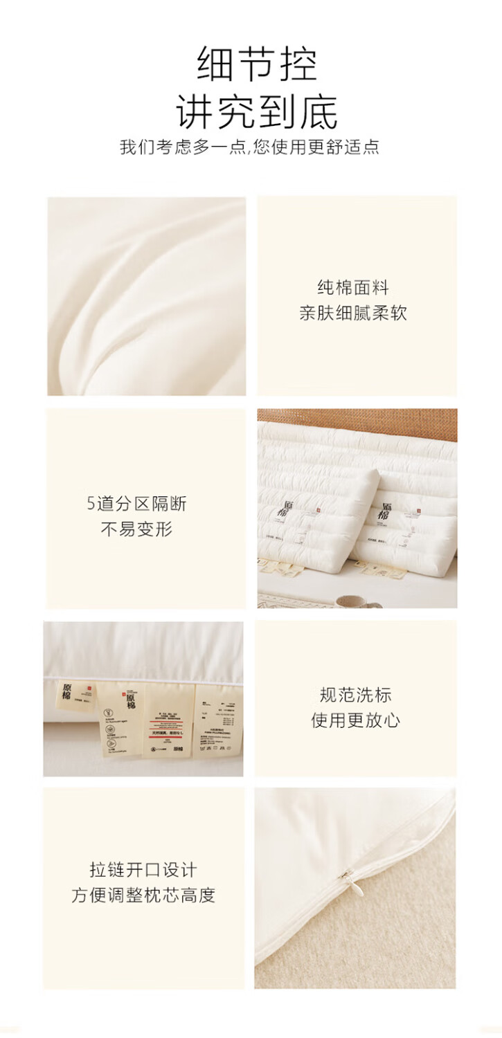 A类全棉不染面料,无甲醛,无芳香胺,无银光剂无漂染;柔软服帖的手感,脖肩颈自然无缝贴合,告别颈椎悬空;超细纤维填充,柔软高弹性,宽大枕面;五道分区隔断,解放睡姿轻松入睡;